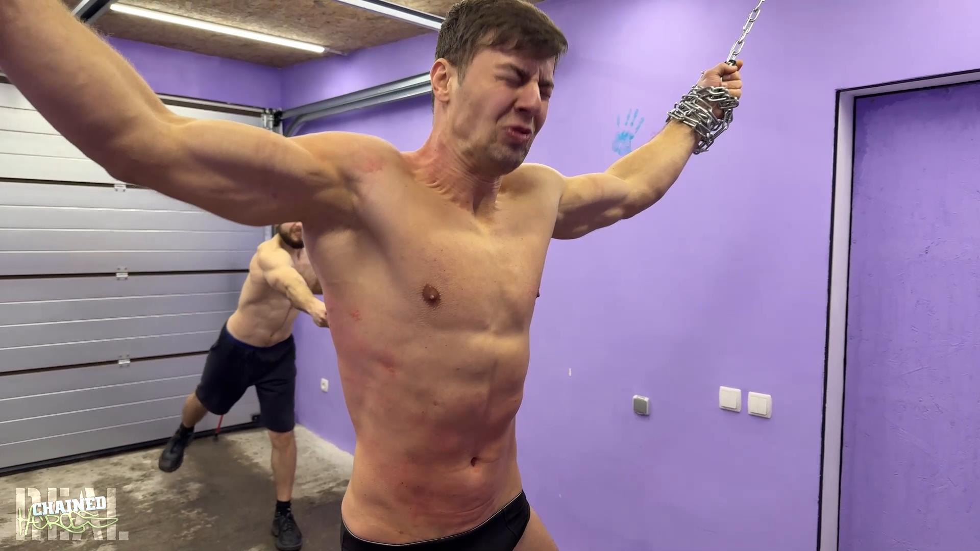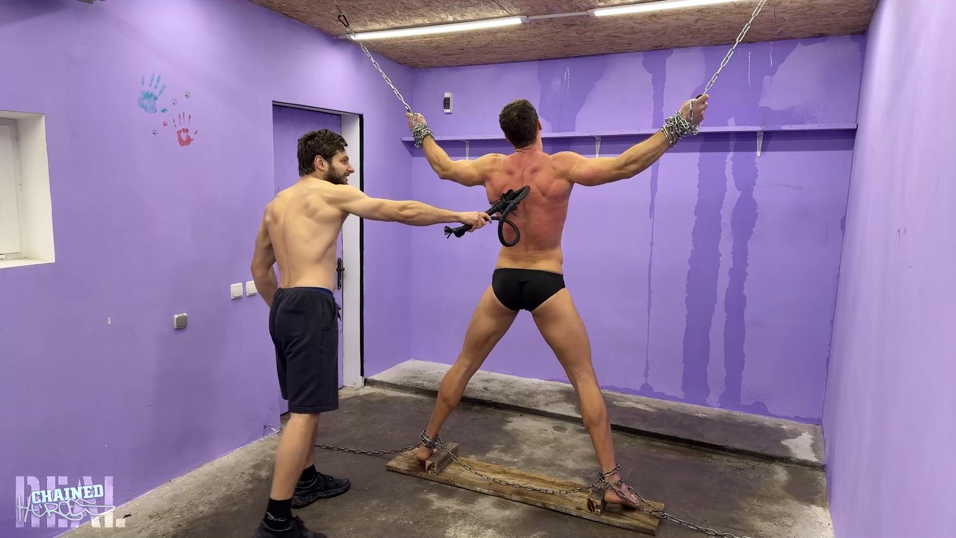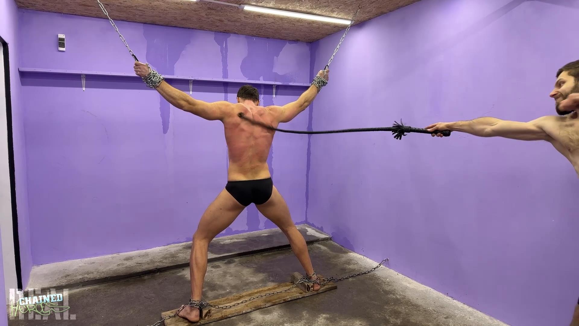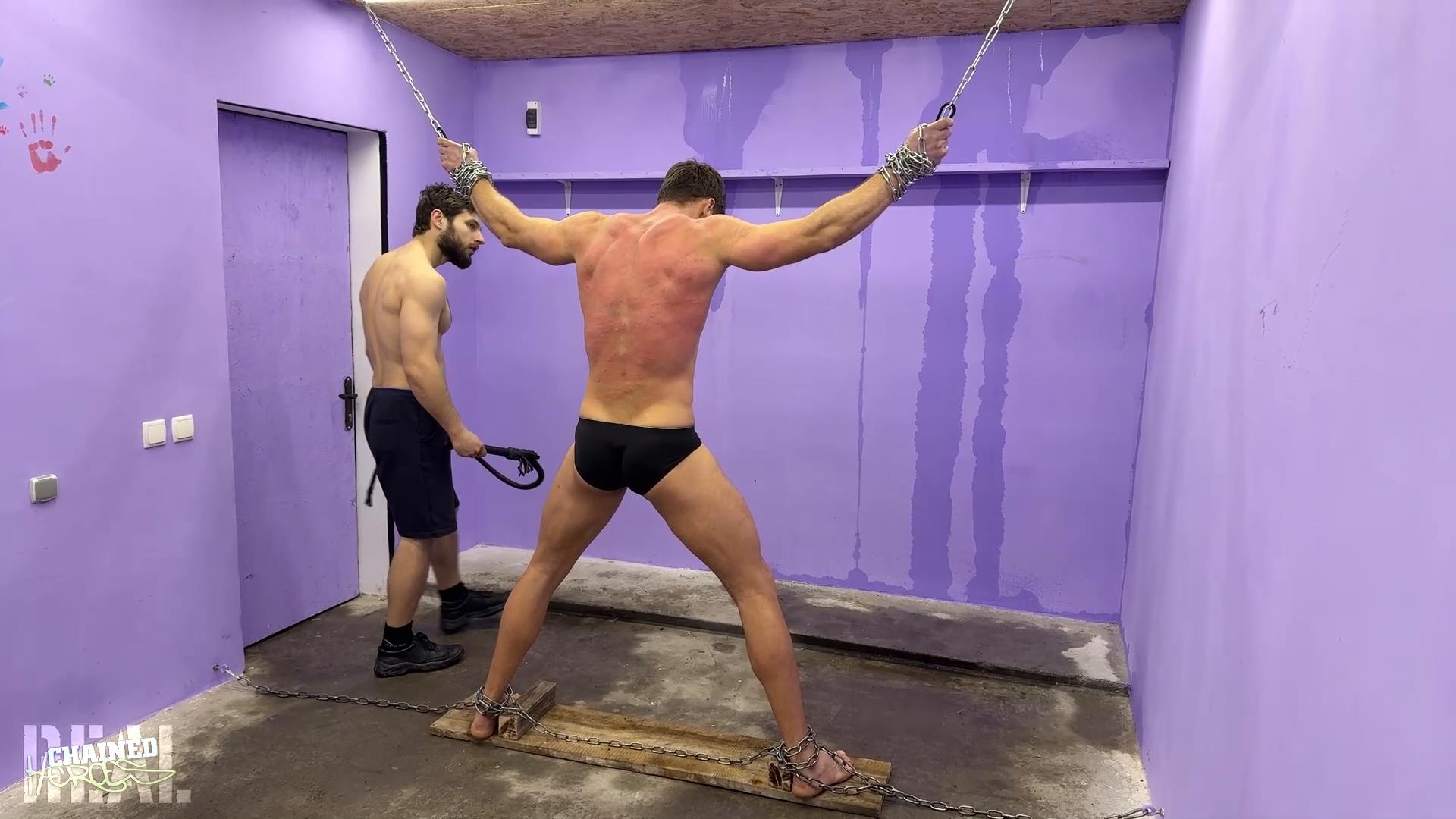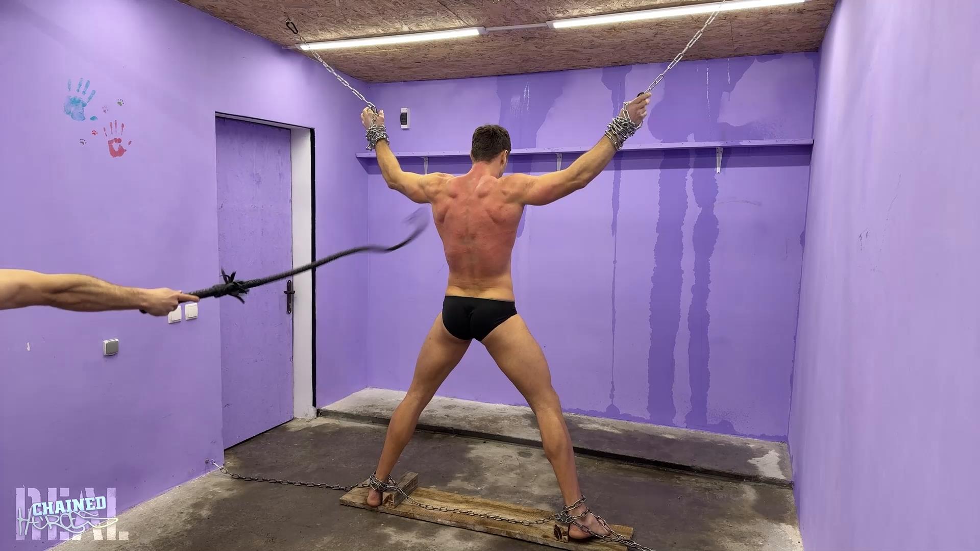 We next discover our ALEX, back in the Purple Punishment Room, chained in a standing spread-eagle. DIMA returns with a nasty-looking bullwhip, his only comment to ALEX being: “I will KILL you!” Then DIMA returns to his “job”: TORTURING ALEX! This time: SEVERE CONTINUOUS WHIPPING. DIMA uses the bullwhip on ALEX’S back for a good 20 minutes of non-stop torture! “Do you like it?” DIMA asks ALEX, again and again… and again. And the answer is always the same: “FUCK YOU!”