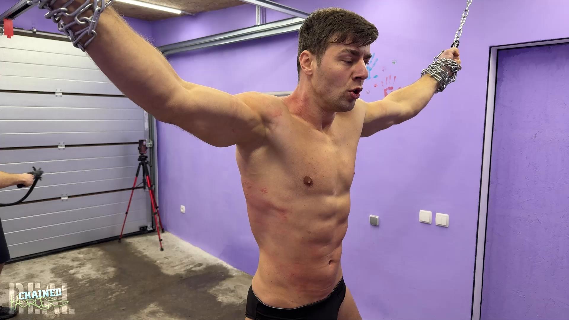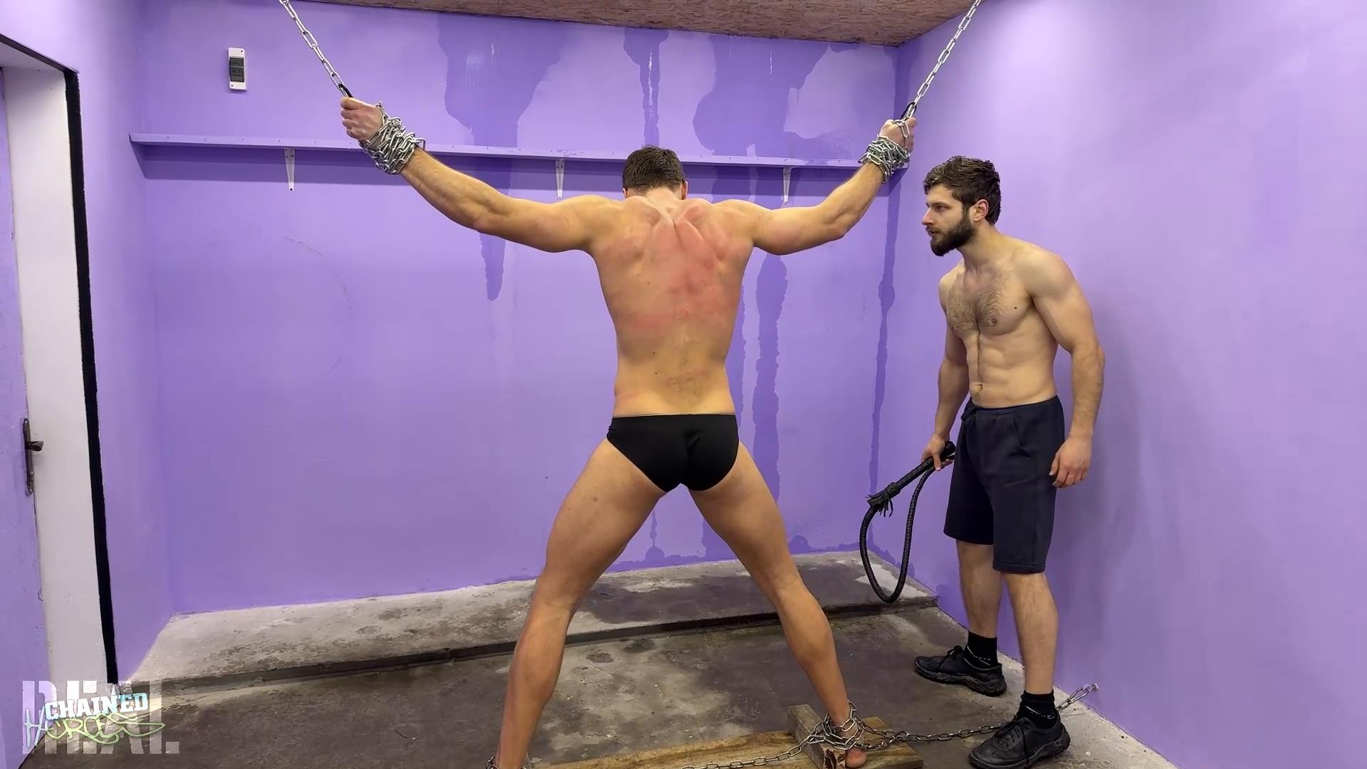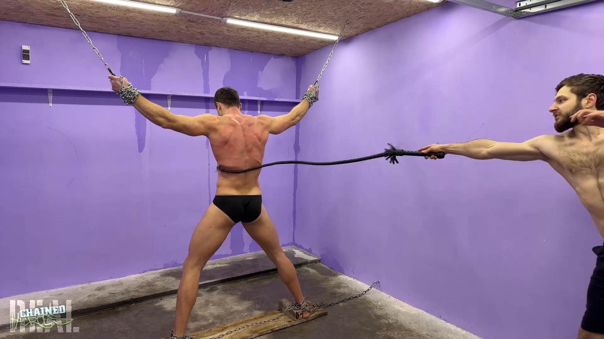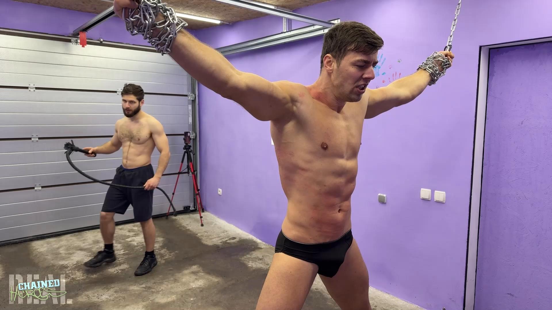 We next discover our ALEX, back in the Purple Punishment Room, chained in a standing spread-eagle. DIMA returns with a nasty-looking bullwhip, his only comment to ALEX being: “I will KILL you!” Then DIMA returns to his “job”: TORTURING ALEX! This time: SEVERE CONTINUOUS WHIPPING. DIMA uses the bullwhip on ALEX’S back for a good 20 minutes of non-stop torture! “Do you like it?” DIMA asks ALEX, again and again… and again. And the answer is always the same: “FUCK YOU!”