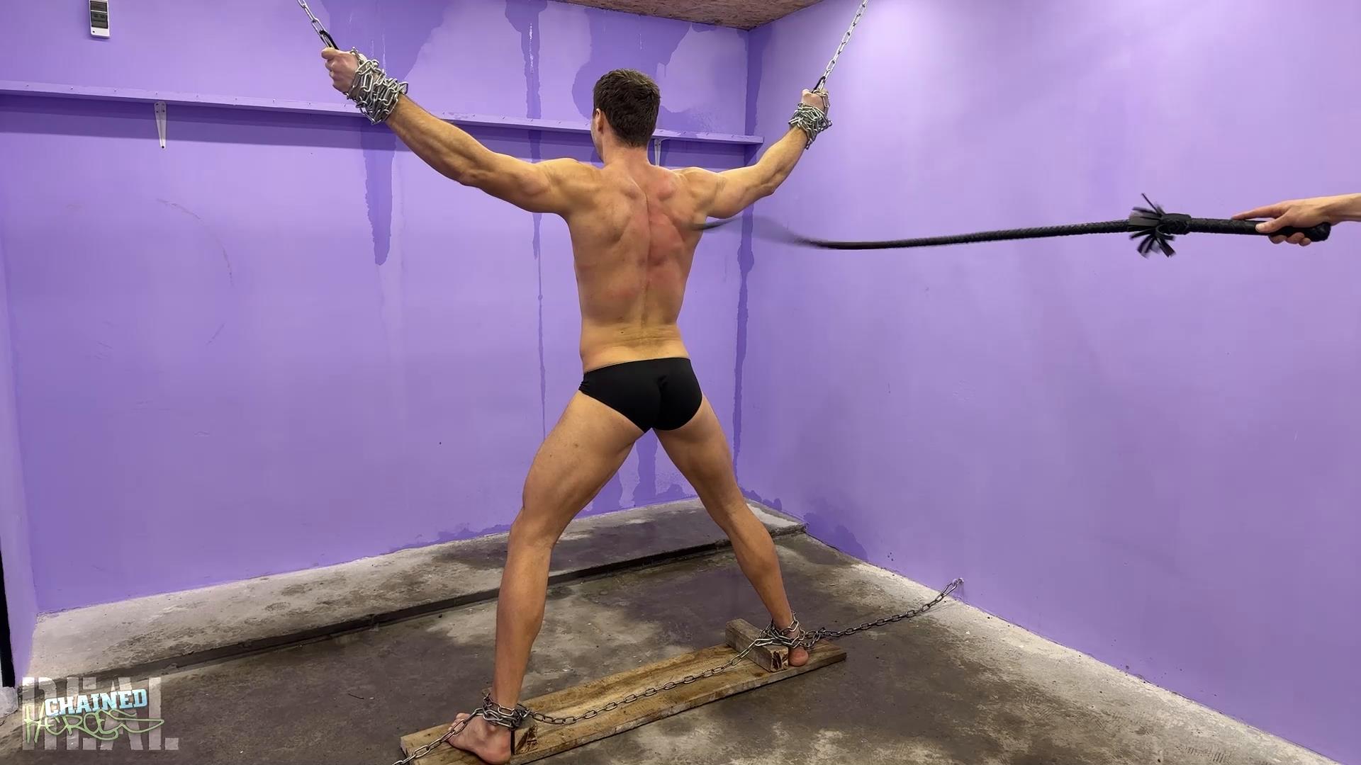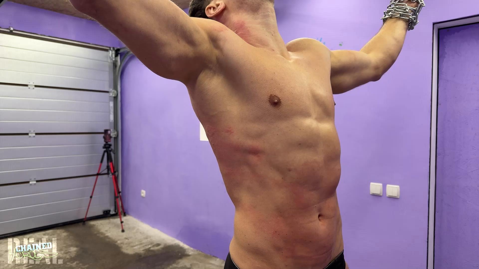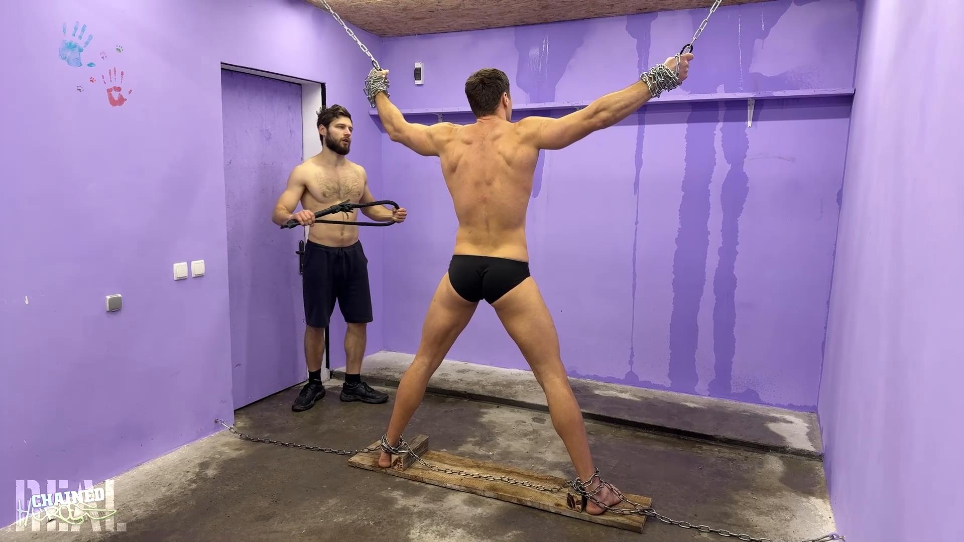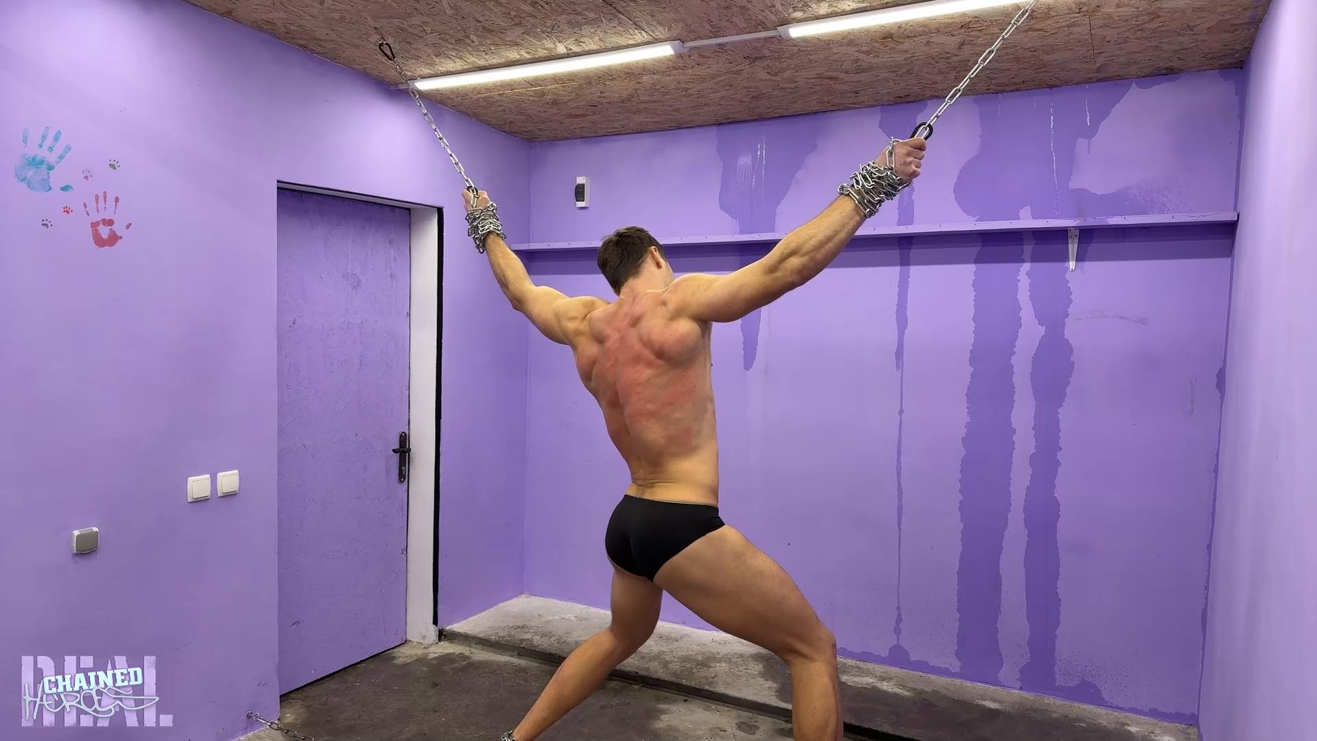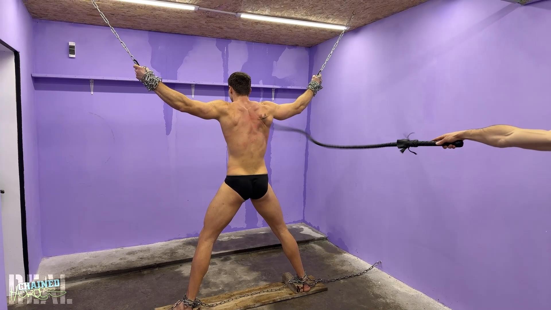 We next discover our ALEX, back in the Purple Punishment Room, chained in a standing spread-eagle. DIMA returns with a nasty-looking bullwhip, his only comment to ALEX being: “I will KILL you!” Then DIMA returns to his “job”: TORTURING ALEX! This time: SEVERE CONTINUOUS WHIPPING. DIMA uses the bullwhip on ALEX’S back for a good 20 minutes of non-stop torture! “Do you like it?” DIMA asks ALEX, again and again… and again. And the answer is always the same: “FUCK YOU!”