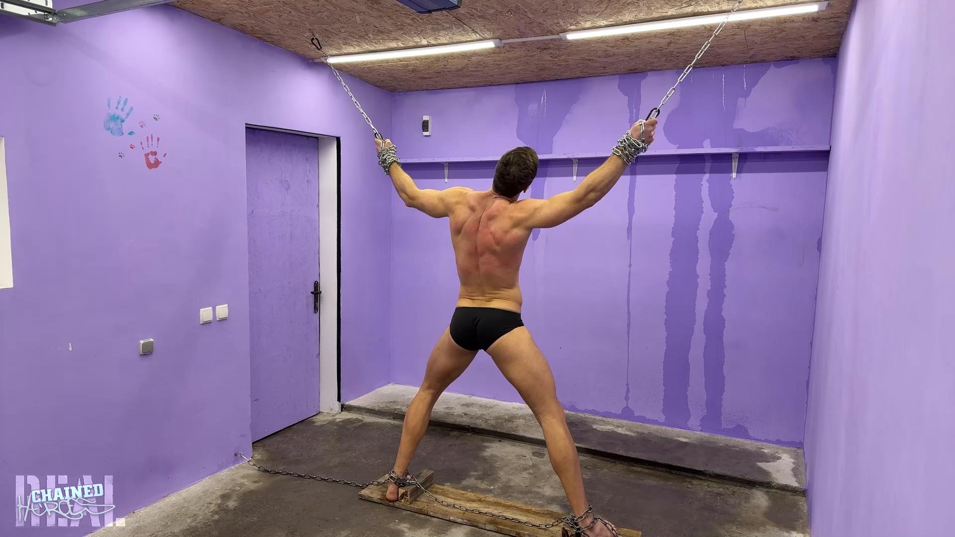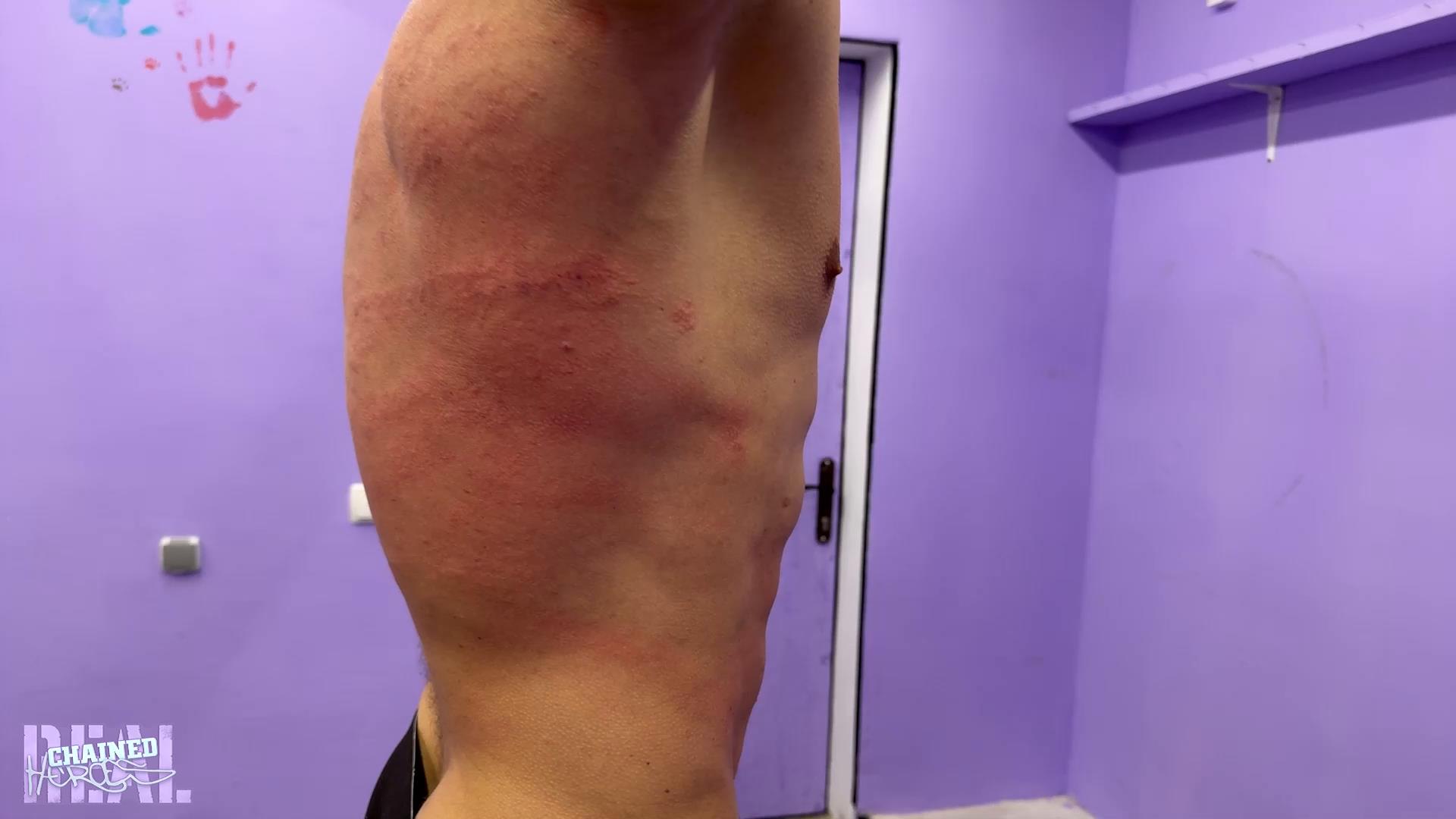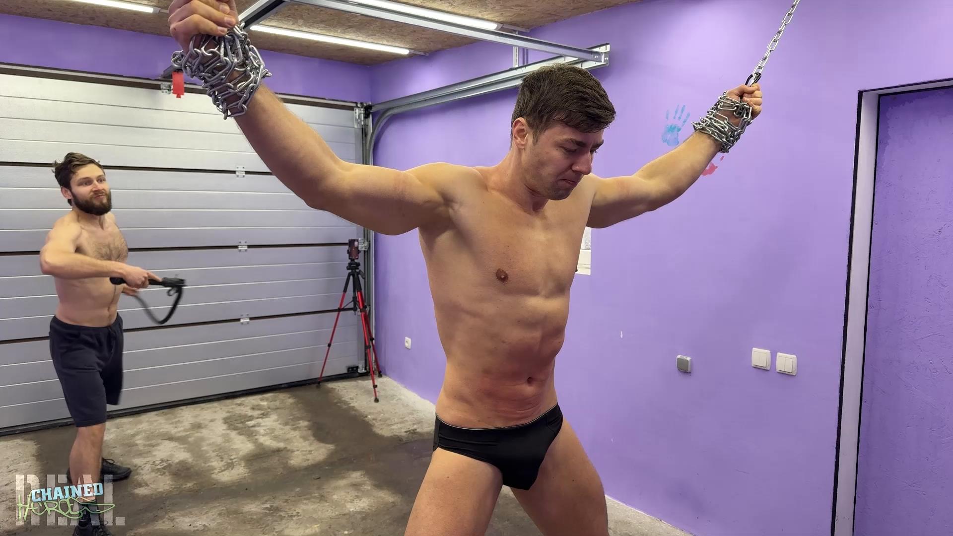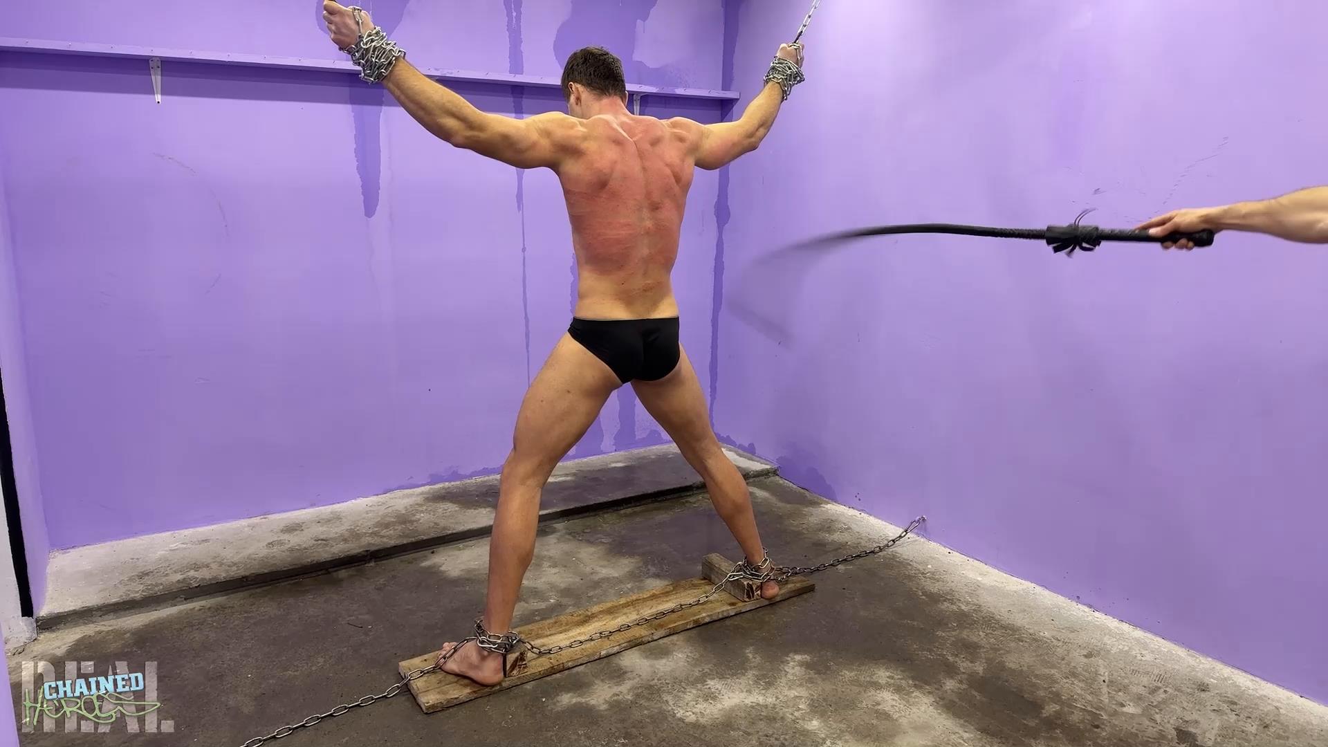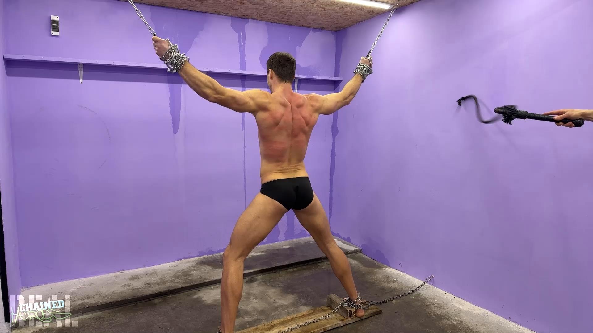 We next discover our ALEX, back in the Purple Punishment Room, chained in a standing spread-eagle. DIMA returns with a nasty-looking bullwhip, his only comment to ALEX being: “I will KILL you!” Then DIMA returns to his “job”: TORTURING ALEX! This time: SEVERE CONTINUOUS WHIPPING. DIMA uses the bullwhip on ALEX’S back for a good 20 minutes of non-stop torture! “Do you like it?” DIMA asks ALEX, again and again… and again. And the answer is always the same: “FUCK YOU!”