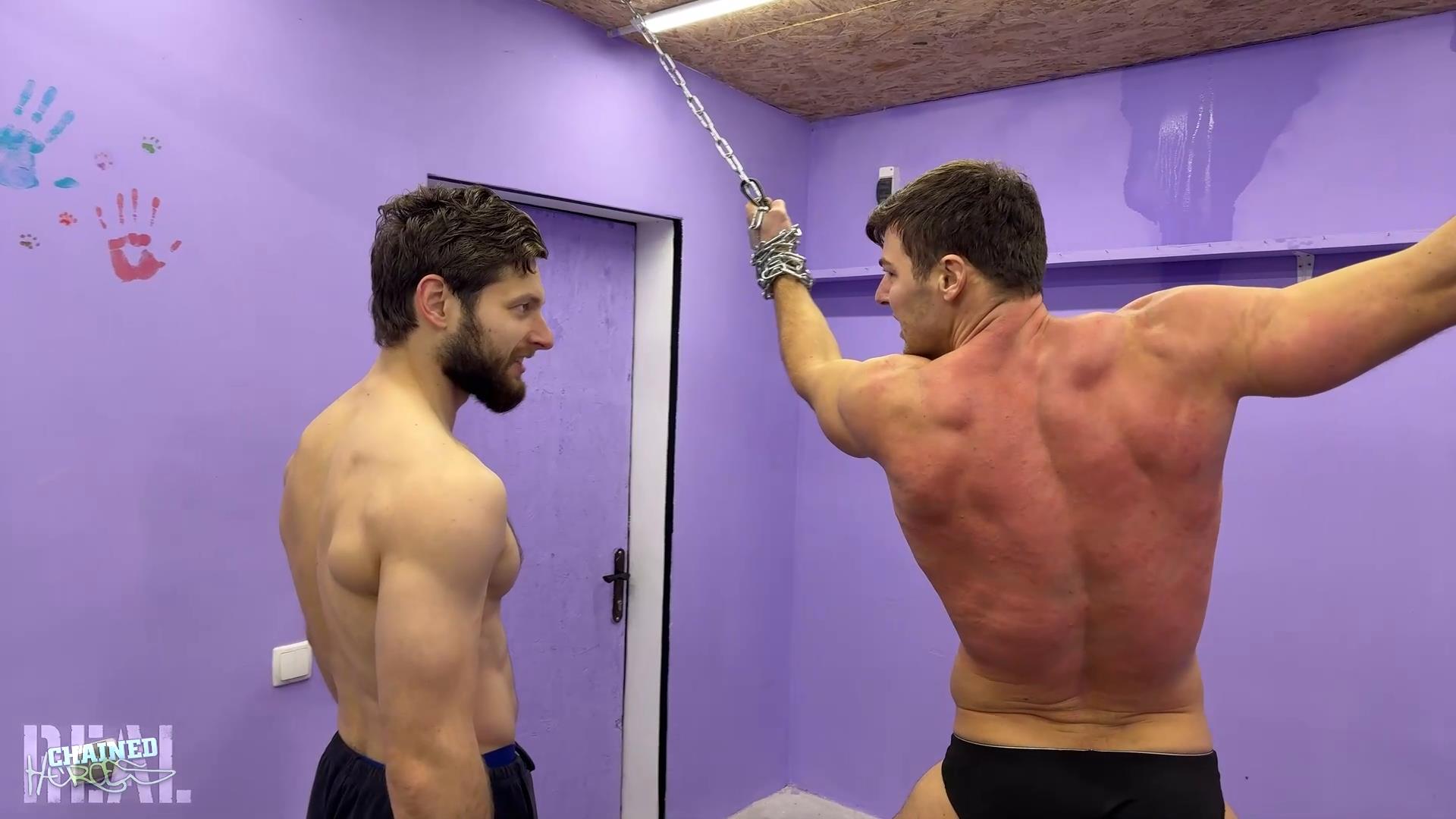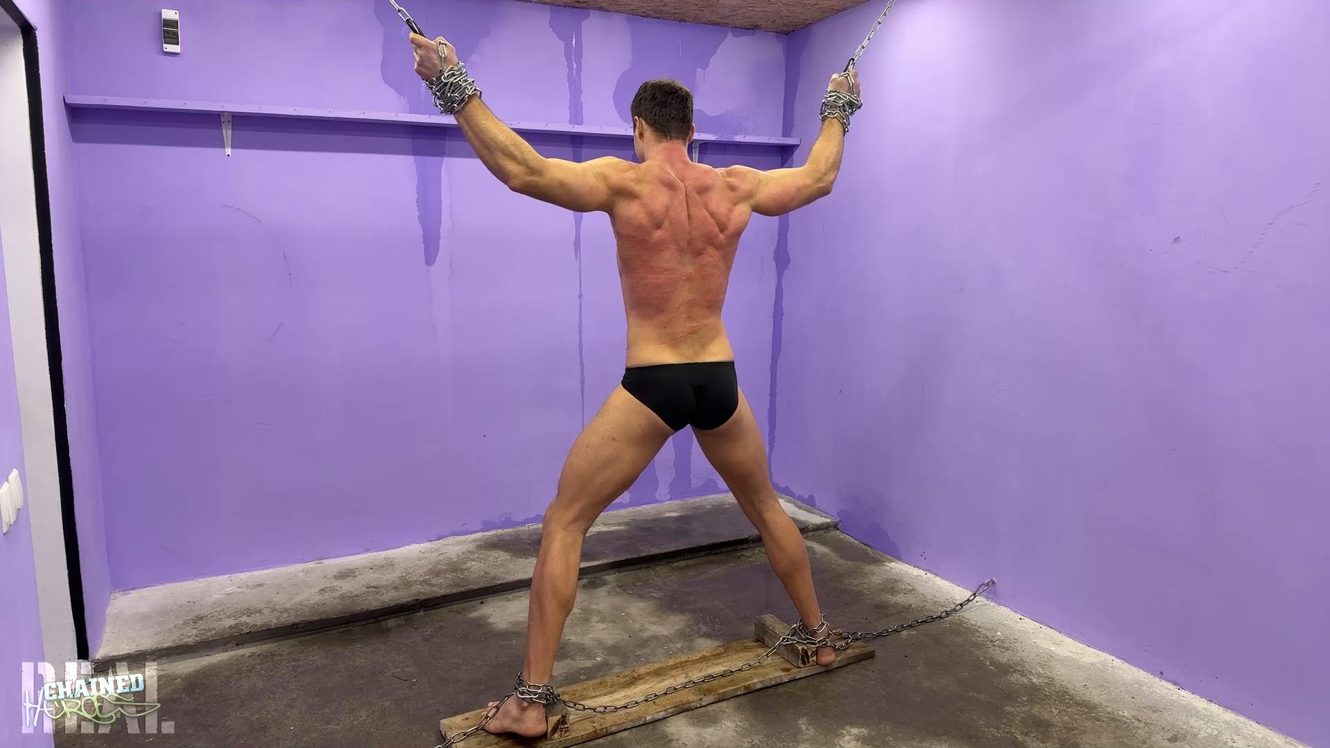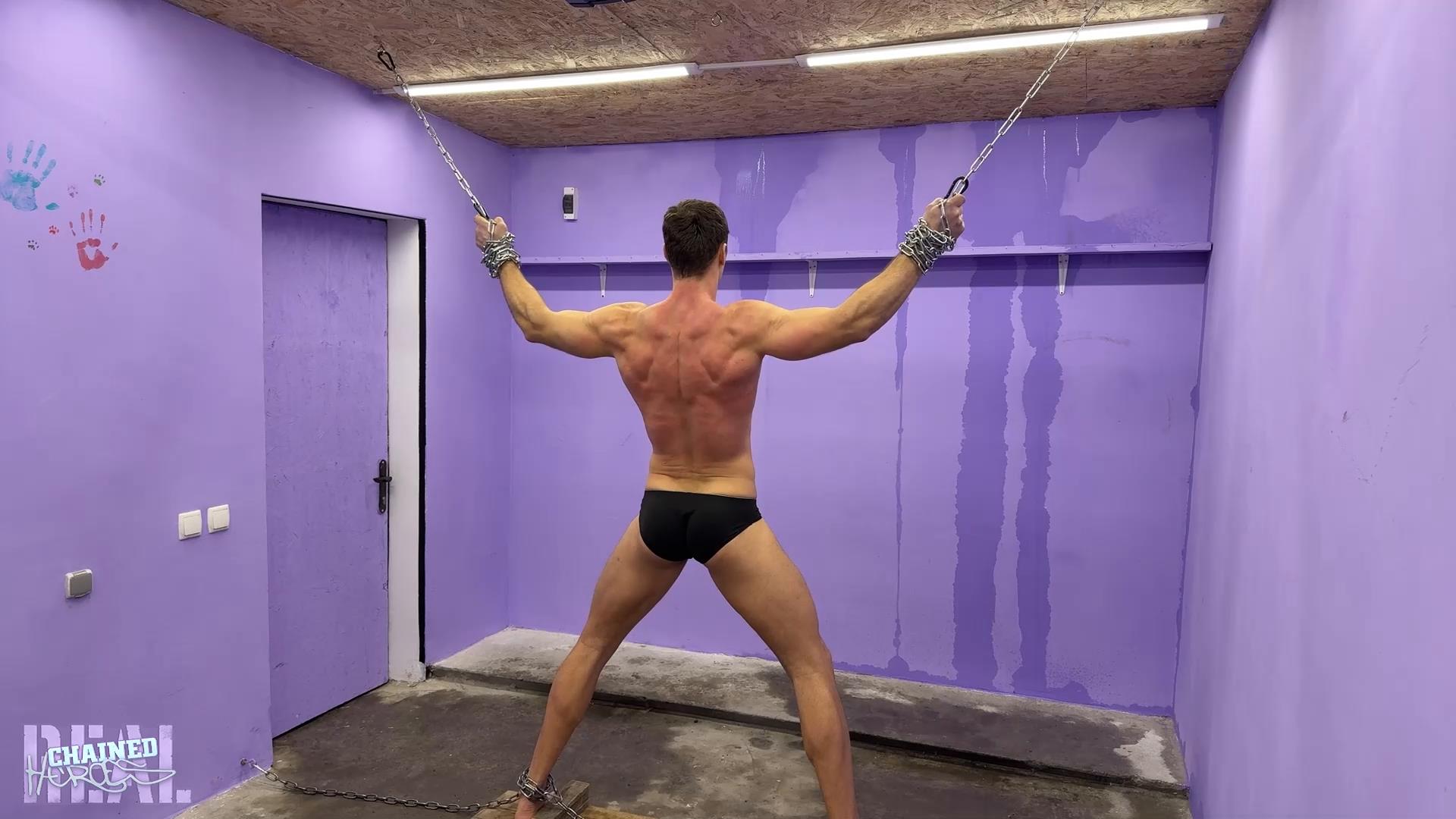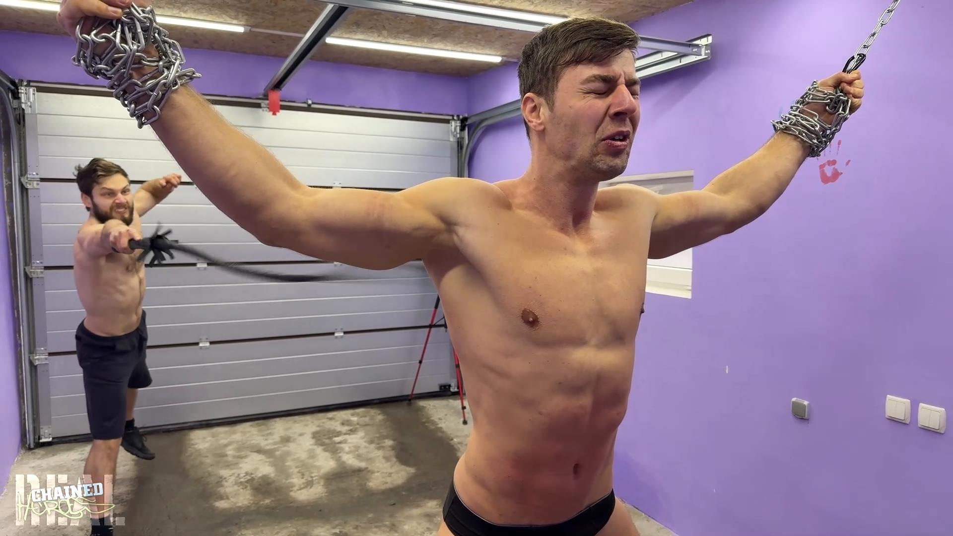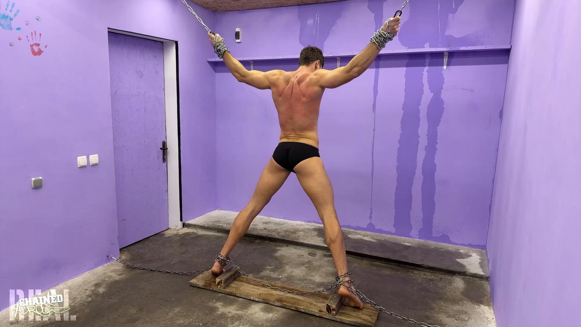 We next discover our ALEX, back in the Purple Punishment Room, chained in a standing spread-eagle. DIMA returns with a nasty-looking bullwhip, his only comment to ALEX being: “I will KILL you!” Then DIMA returns to his “job”: TORTURING ALEX! This time: SEVERE CONTINUOUS WHIPPING. DIMA uses the bullwhip on ALEX’S back for a good 20 minutes of non-stop torture! “Do you like it?” DIMA asks ALEX, again and again… and again. And the answer is always the same: “FUCK YOU!”