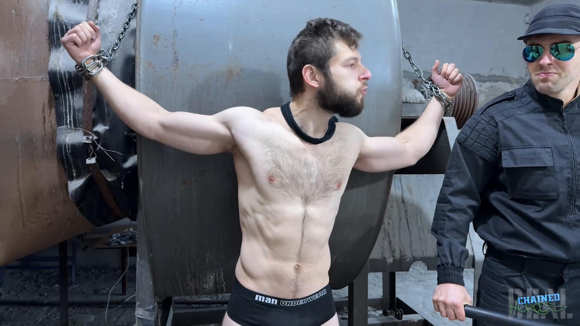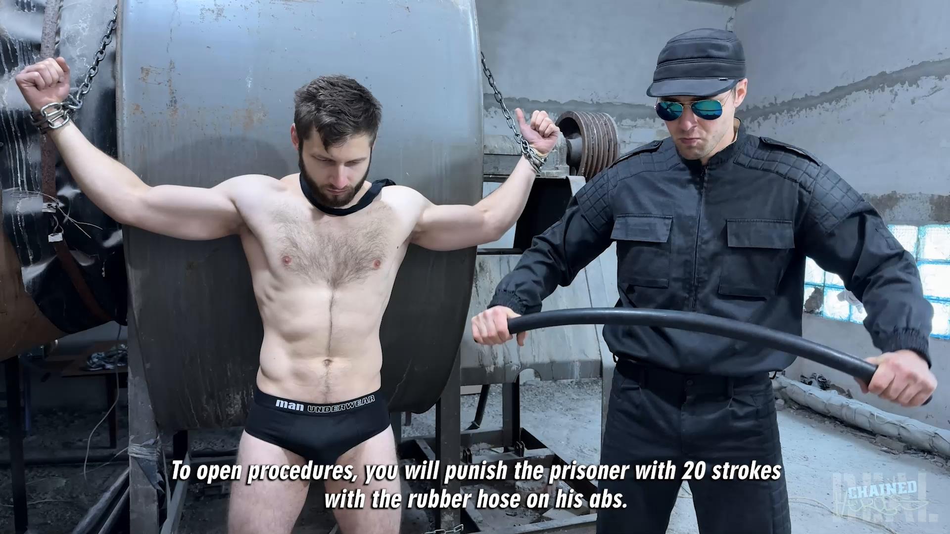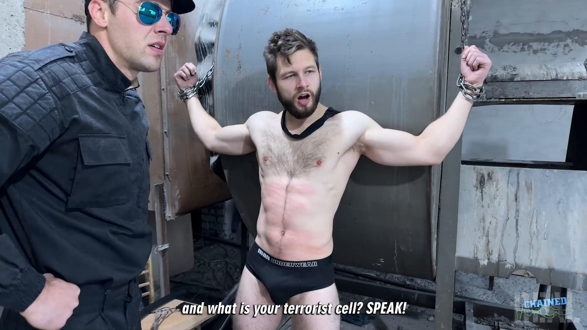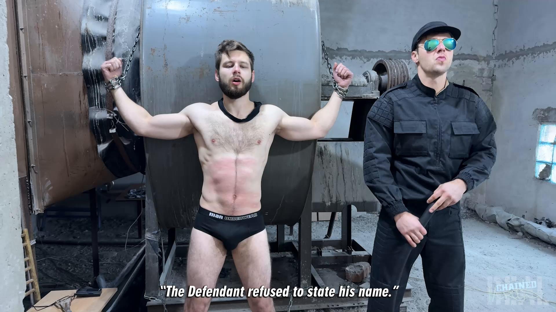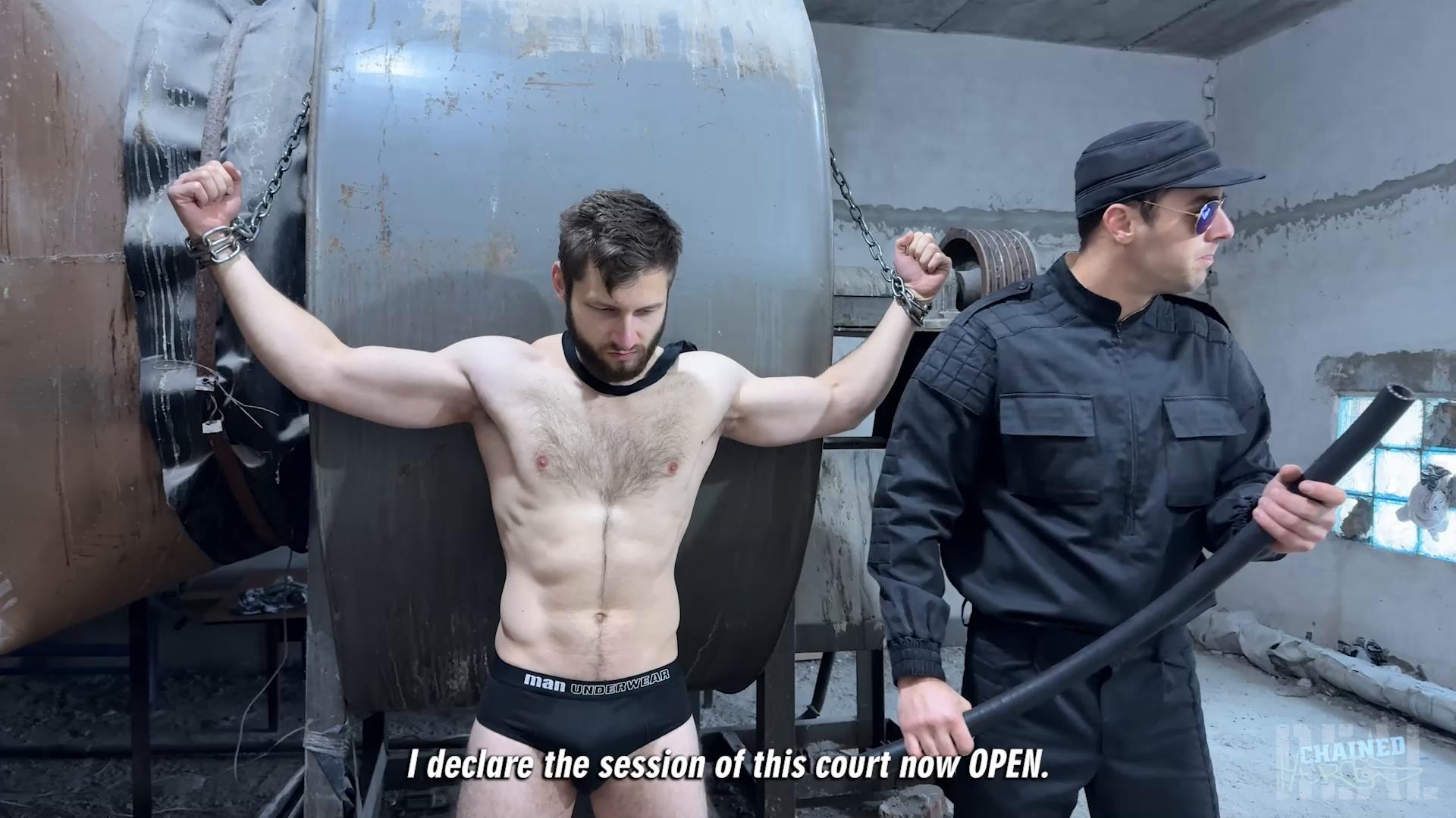 Commando DIMA has been captured by THE ENEMY, and is now put "ON TRIAL” by The Judge while simultaneously being TORTURED by Captain ALEX - PART 1 of 3: “THE TRIAL” BEGINS - DIMA is standing barefoot on bricks, wearing only small, tight, black underwear. He is chained at his wrists & ankles with his arms & legs spread to a large metal drum. DIMA is blindfolded. Next to him, a table with the TORTURE TOOLS he will soon become all-too-familiar with: 2 medium-size Torx screwdrivers, a metal claw & a rubber hose, to be used while The Judge “Confirms or Corrects” DIMA’s first three “Statements”…