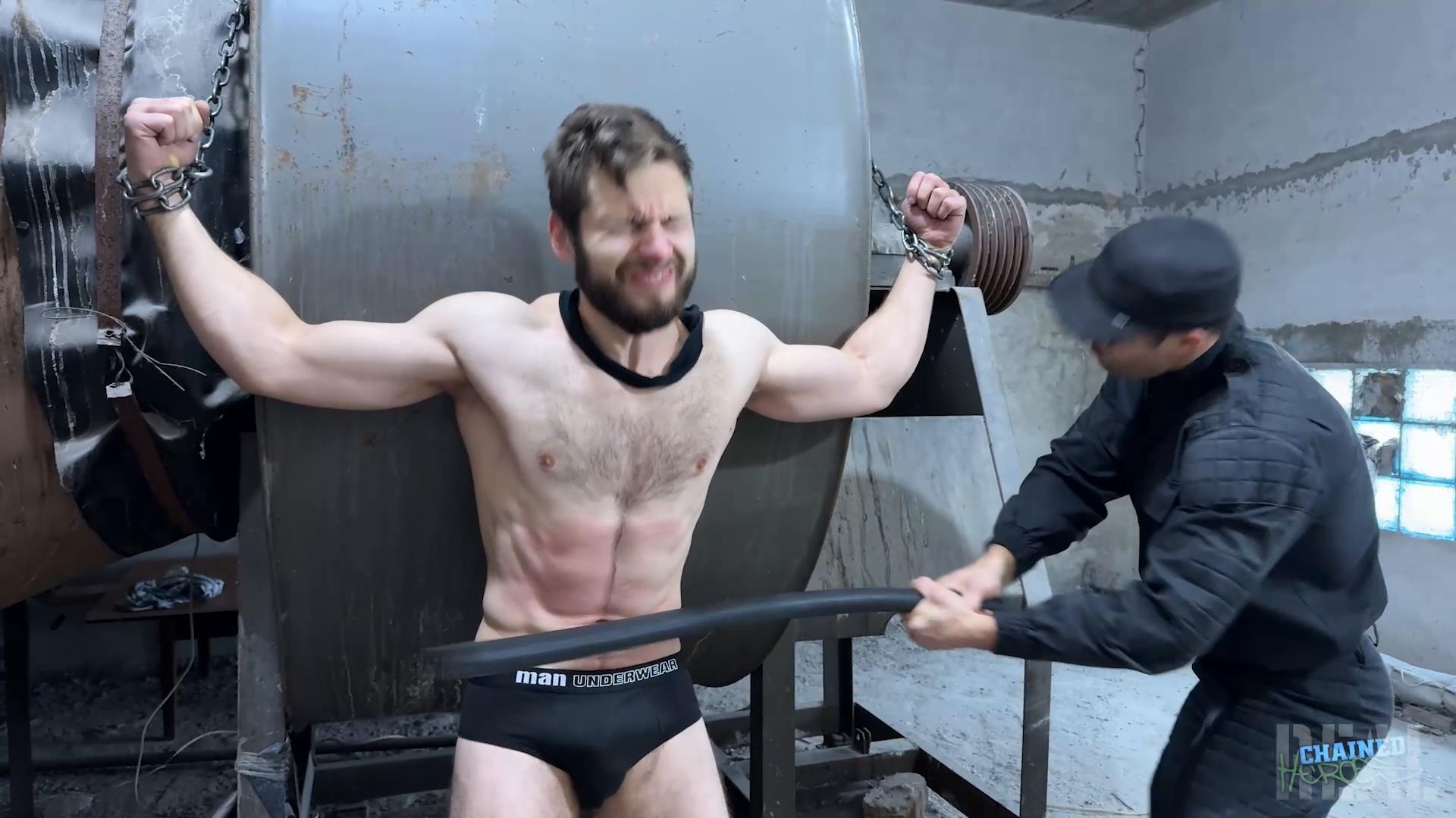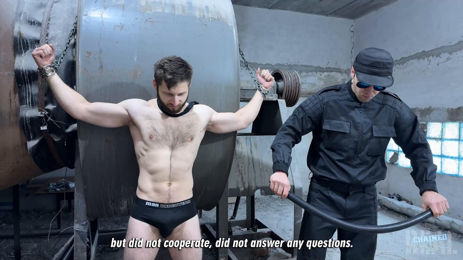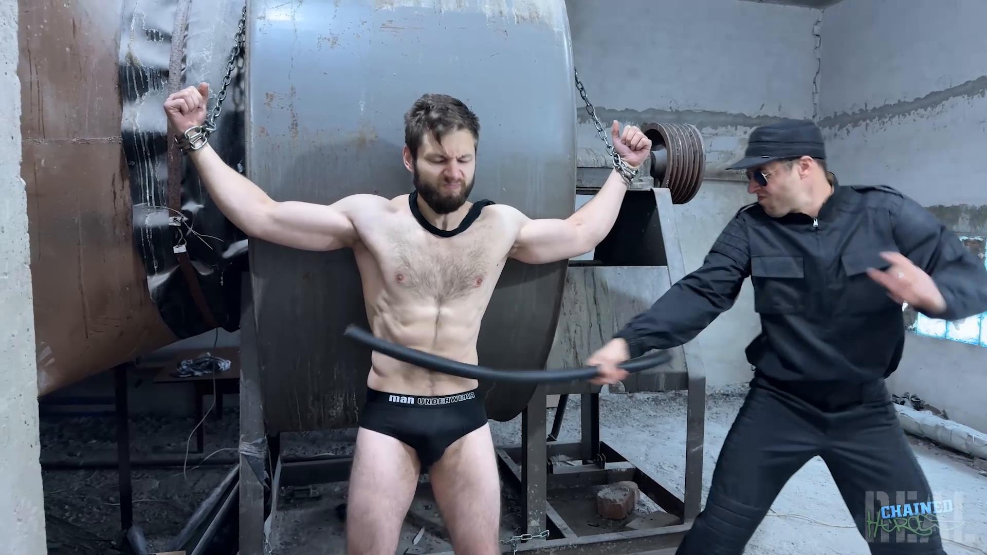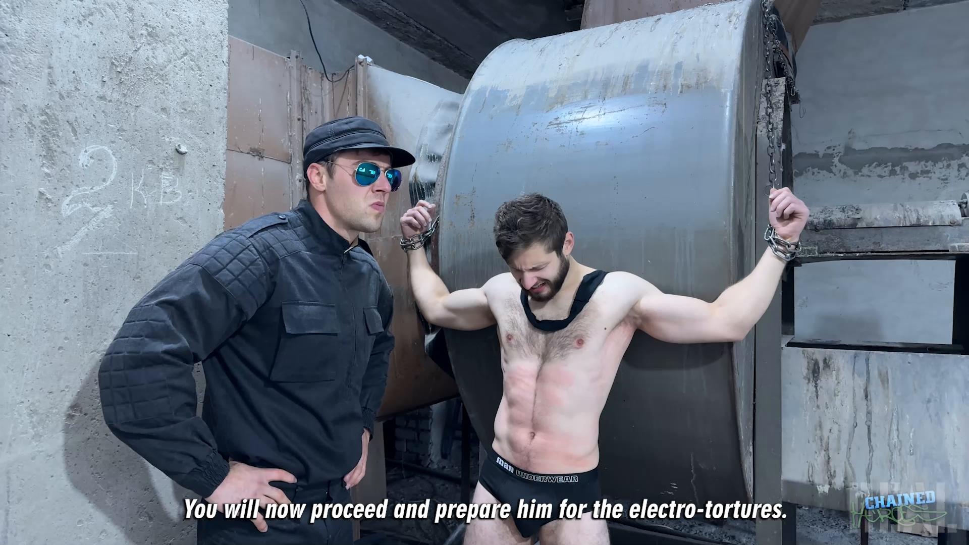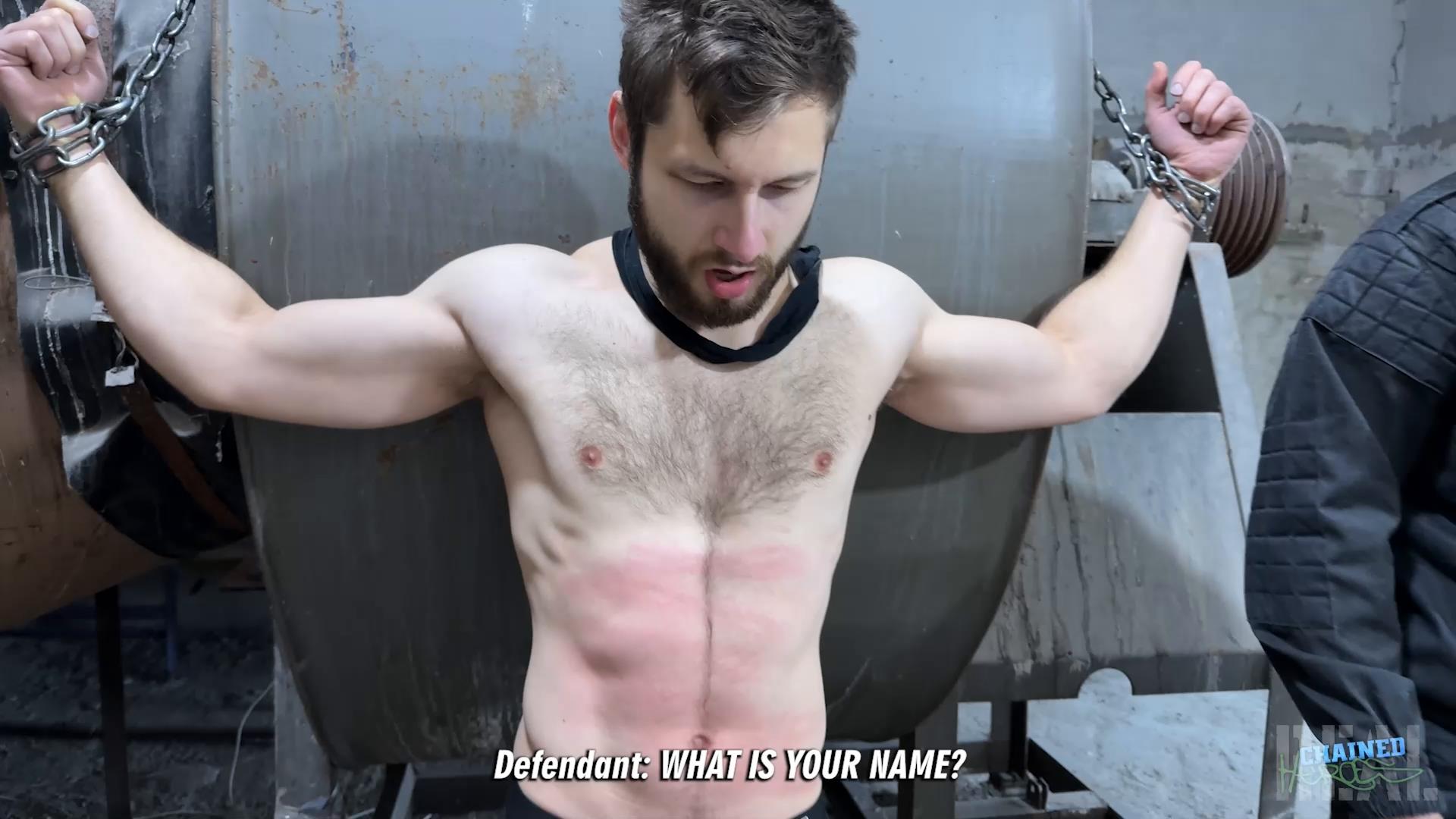 Commando DIMA has been captured by THE ENEMY, and is now put "ON TRIAL” by The Judge while simultaneously being TORTURED by Captain ALEX - PART 1 of 3: “THE TRIAL” BEGINS - DIMA is standing barefoot on bricks, wearing only small, tight, black underwear. He is chained at his wrists & ankles with his arms & legs spread to a large metal drum. DIMA is blindfolded. Next to him, a table with the TORTURE TOOLS he will soon become all-too-familiar with: 2 medium-size Torx screwdrivers, a metal claw & a rubber hose, to be used while The Judge “Confirms or Corrects” DIMA’s first three “Statements”…
