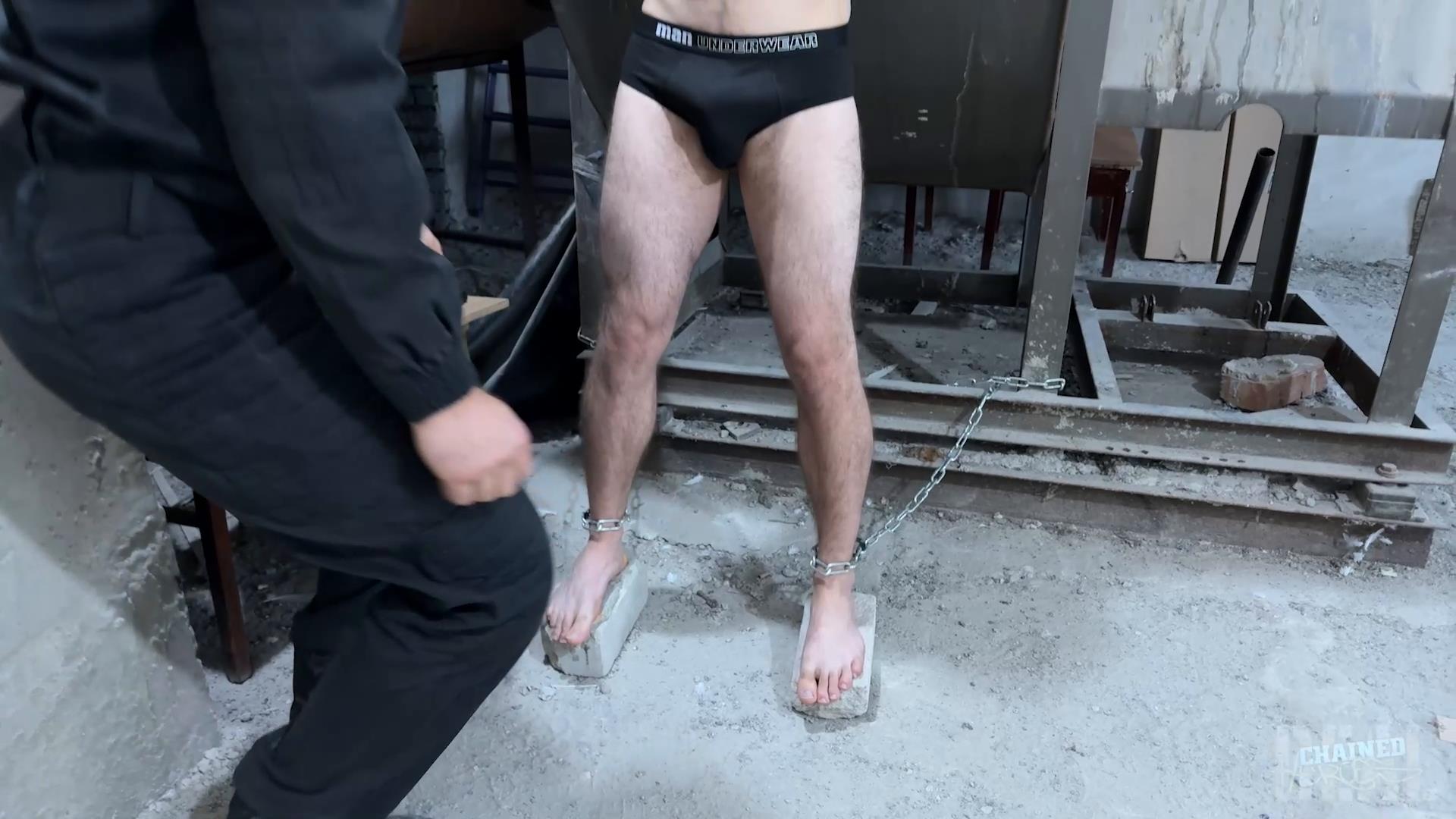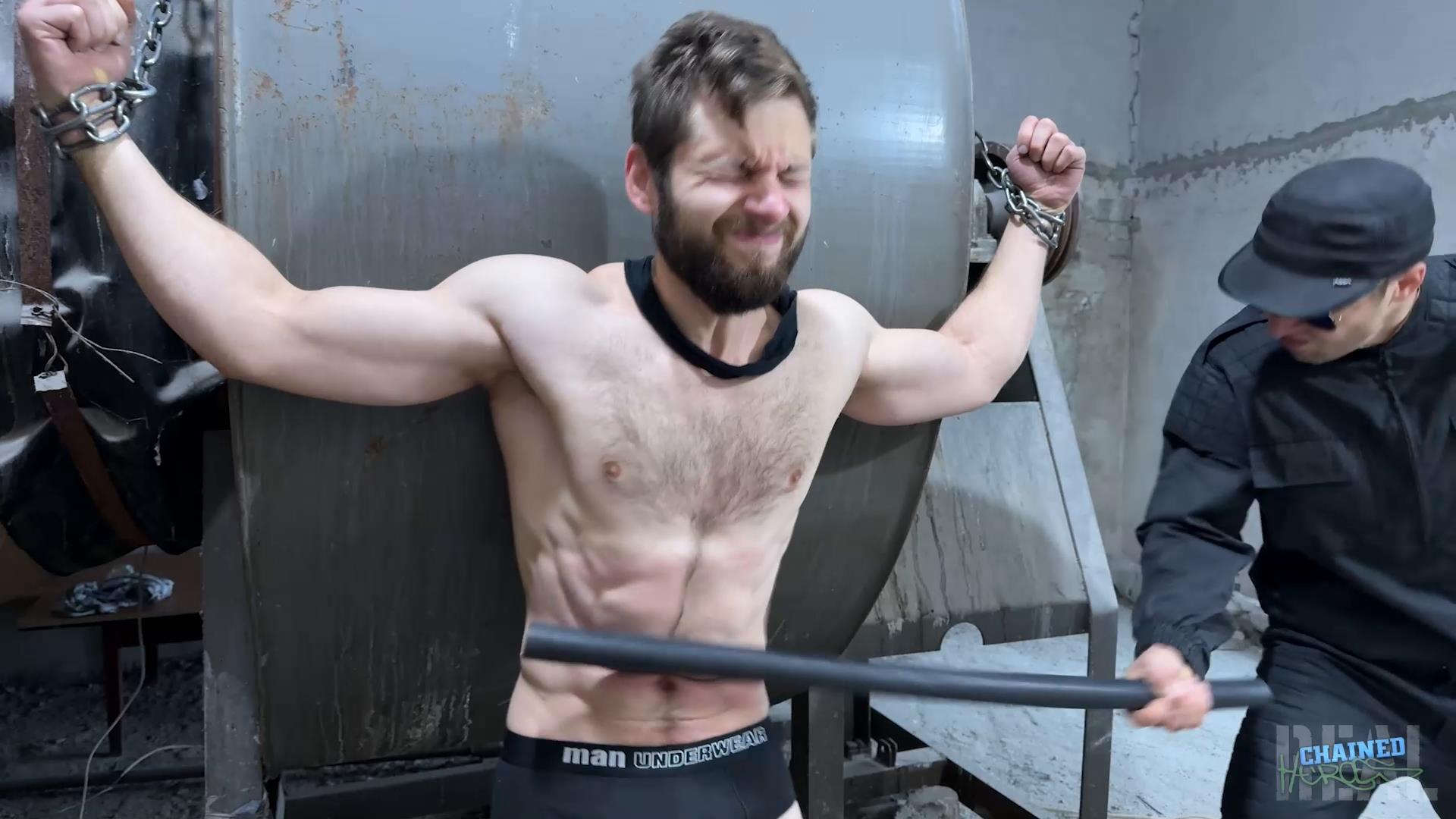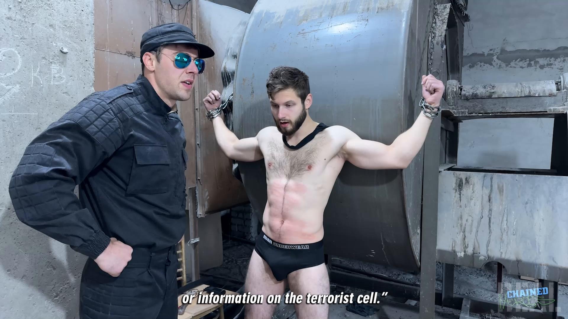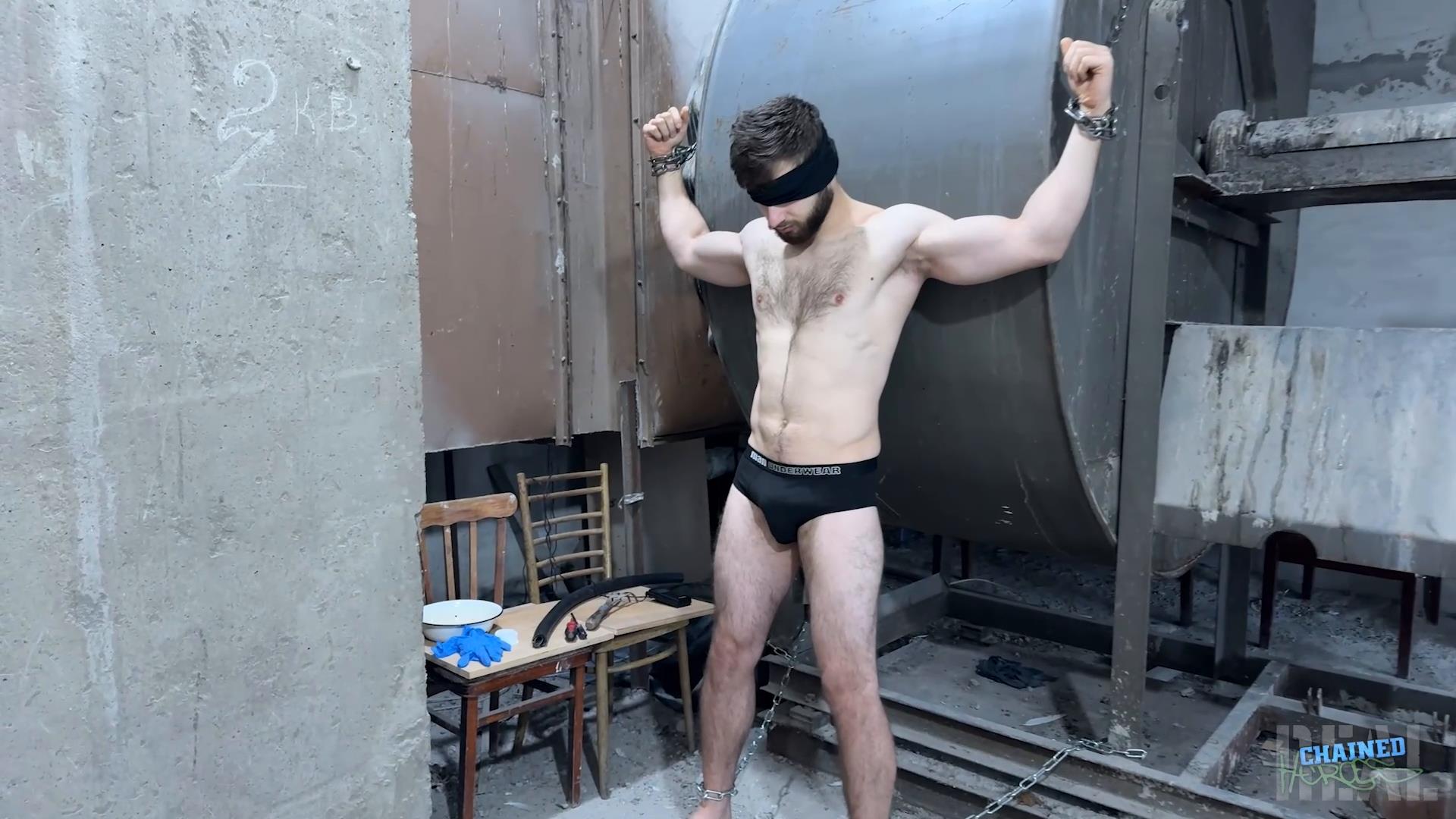Commando DIMA has been captured by THE ENEMY, and is now put "ON TRIAL” by The Judge while simultaneously being TORTURED by Captain ALEX - PART 1 of 3: “THE TRIAL” BEGINS - DIMA is standing barefoot on bricks, wearing only small, tight, black underwear. He is chained at his wrists & ankles with his arms & legs spread to a large metal drum. DIMA is blindfolded. Next to him, a table with the TORTURE TOOLS he will soon become all-too-familiar with: 2 medium-size Torx screwdrivers, a metal claw & a rubber hose, to be used while The Judge “Confirms or Corrects” DIMA’s first three “Statements”…