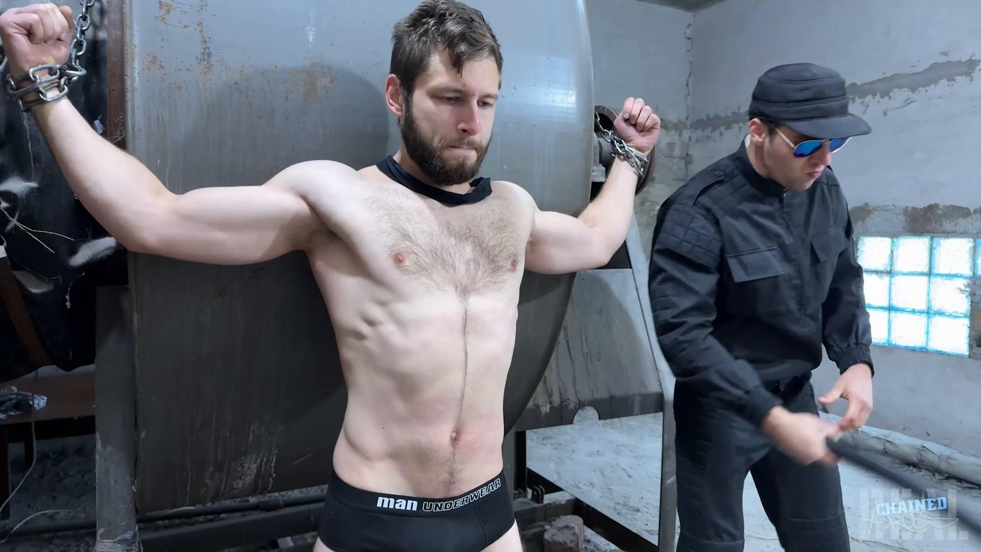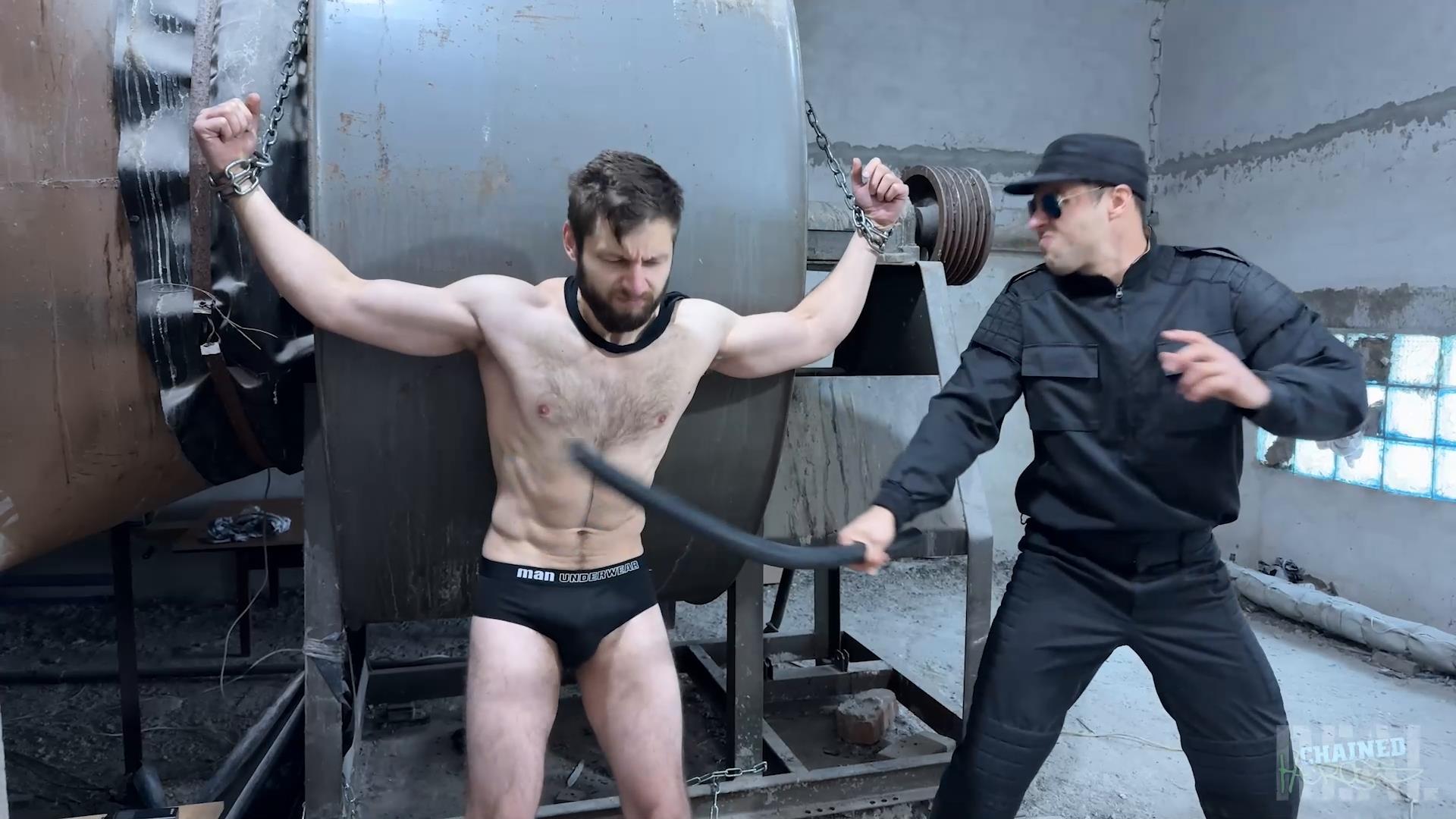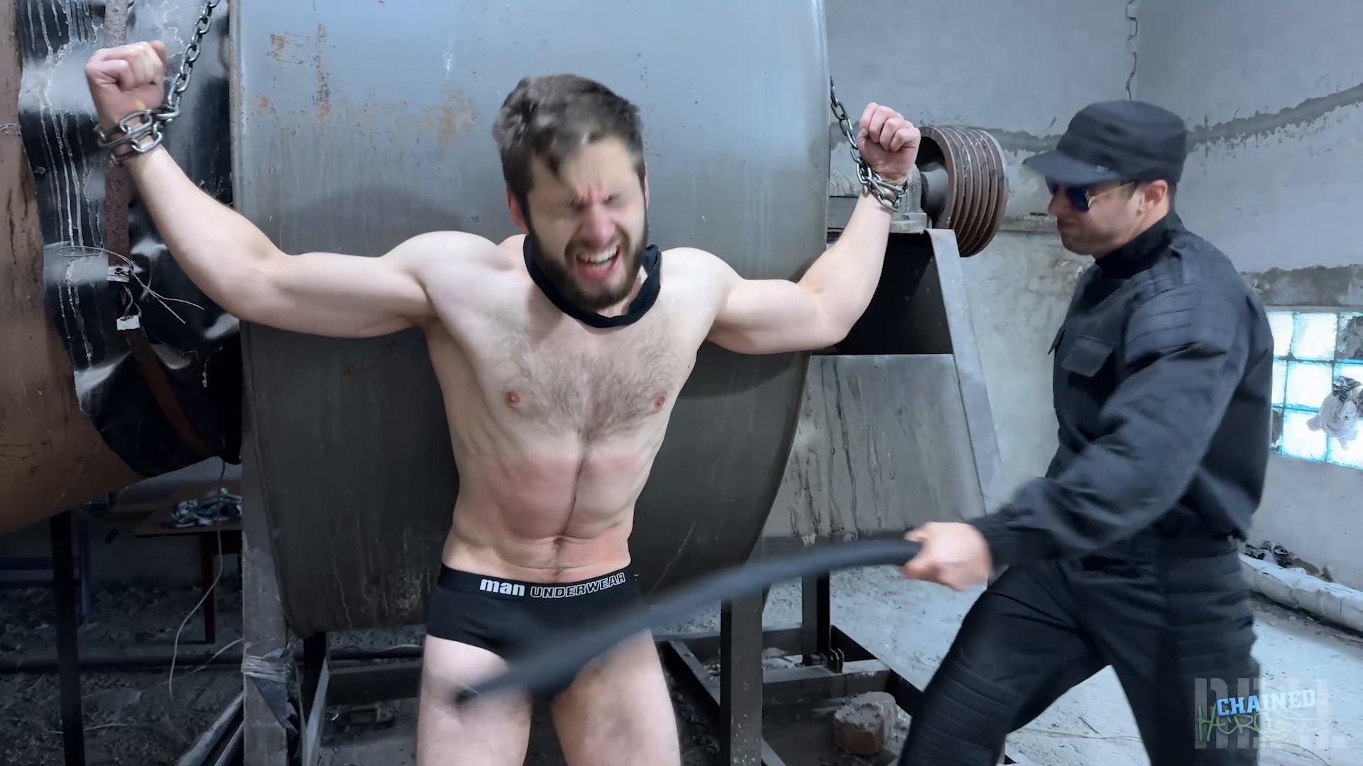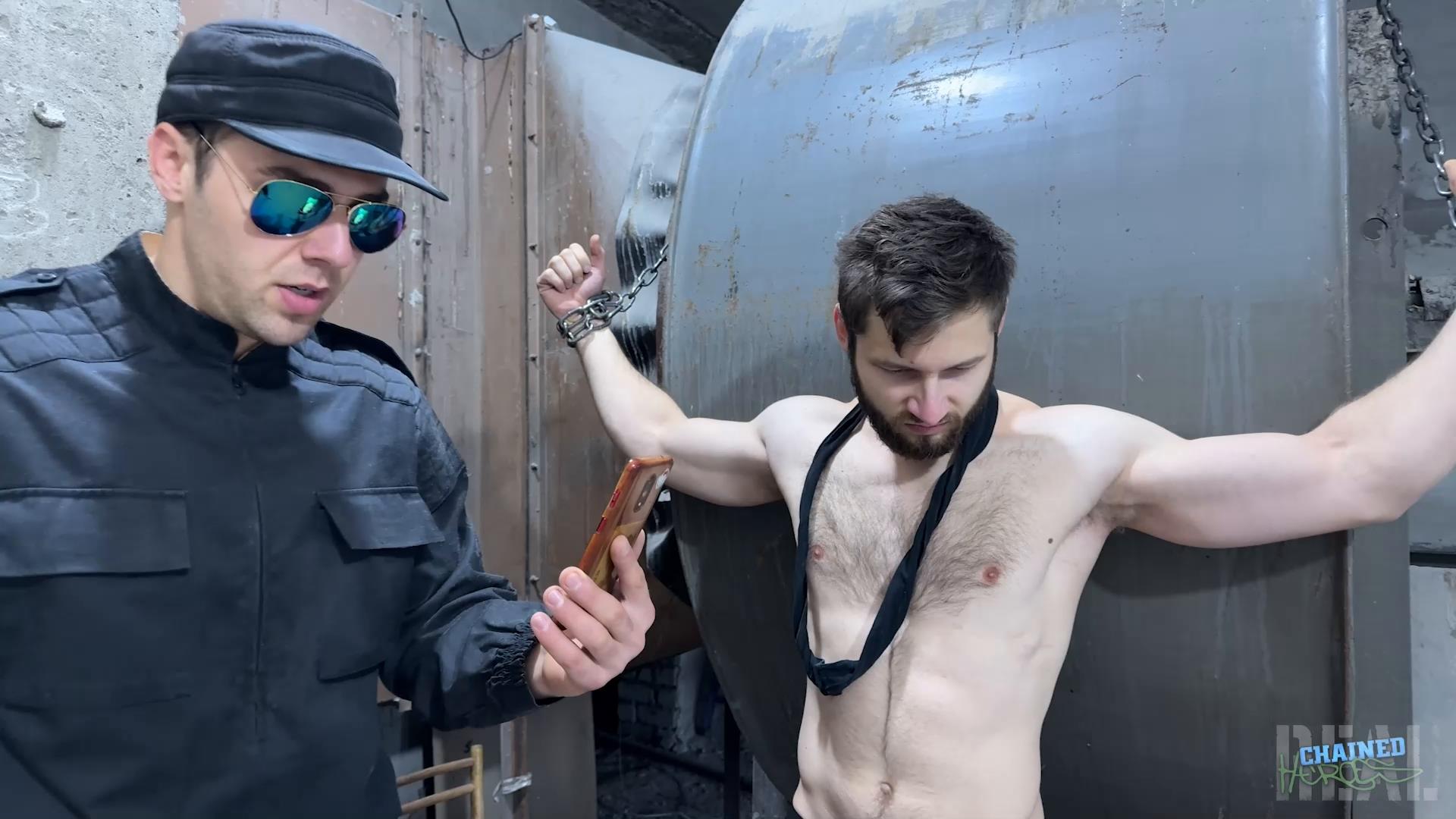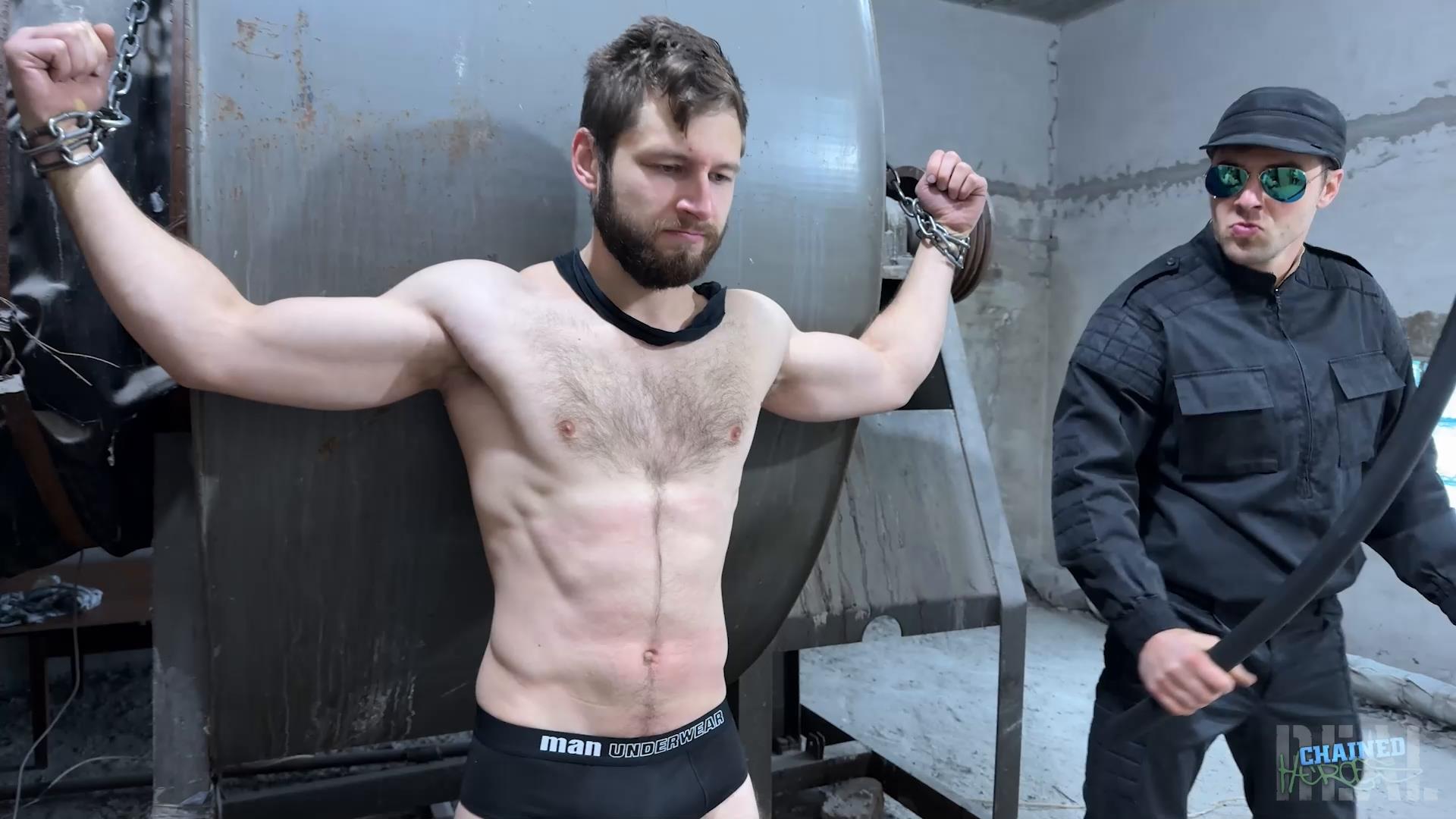 Commando DIMA has been captured by THE ENEMY, and is now put "ON TRIAL” by The Judge while simultaneously being TORTURED by Captain ALEX - PART 1 of 3: “THE TRIAL” BEGINS - DIMA is standing barefoot on bricks, wearing only small, tight, black underwear. He is chained at his wrists & ankles with his arms & legs spread to a large metal drum. DIMA is blindfolded. Next to him, a table with the TORTURE TOOLS he will soon become all-too-familiar with: 2 medium-size Torx screwdrivers, a metal claw & a rubber hose, to be used while The Judge “Confirms or Corrects” DIMA’s first three “Statements”…