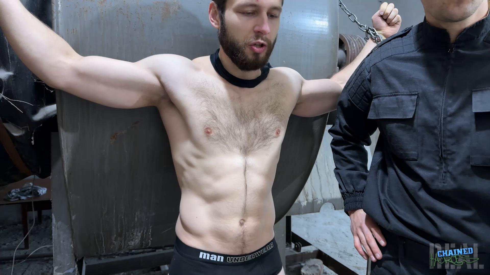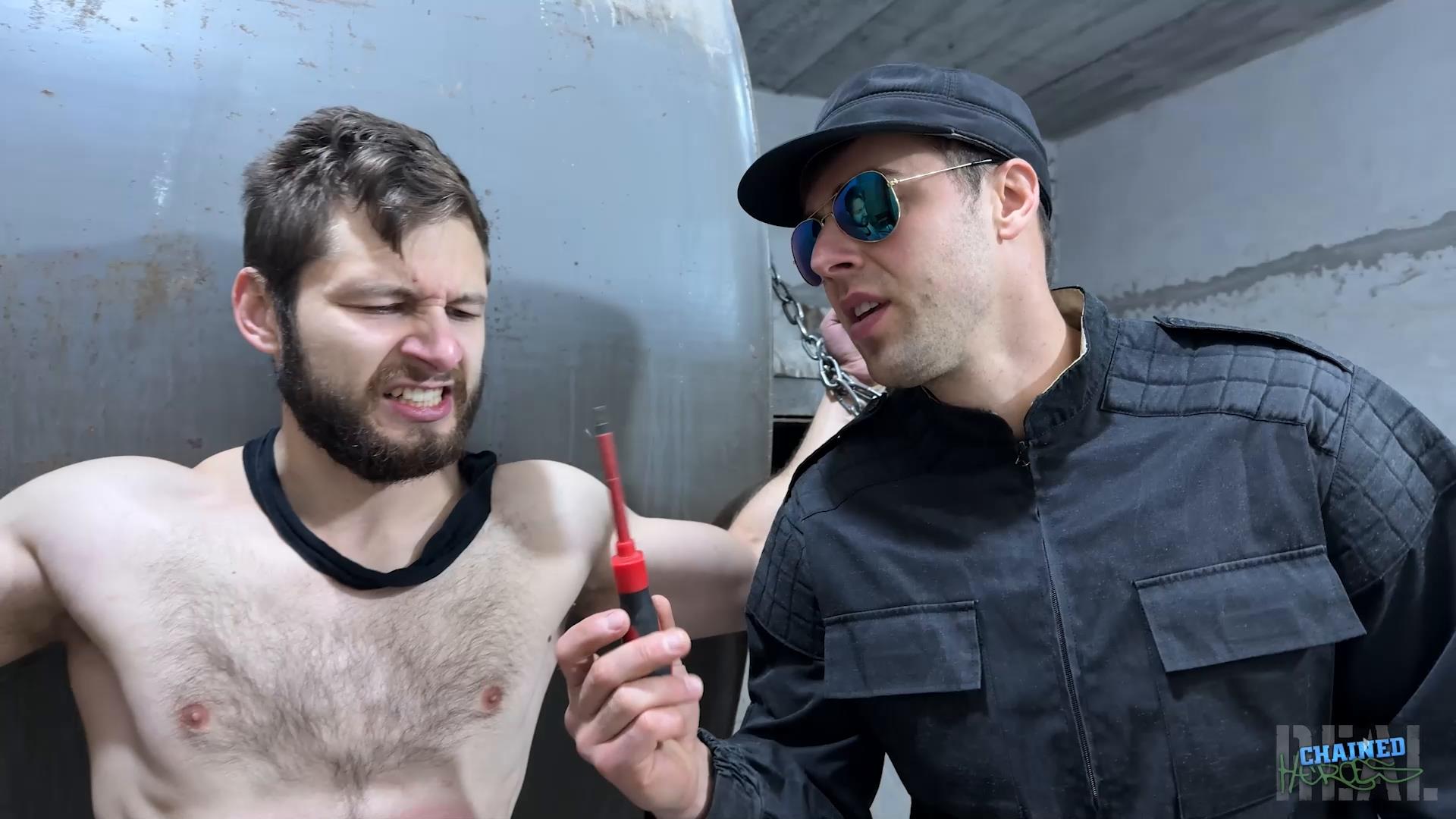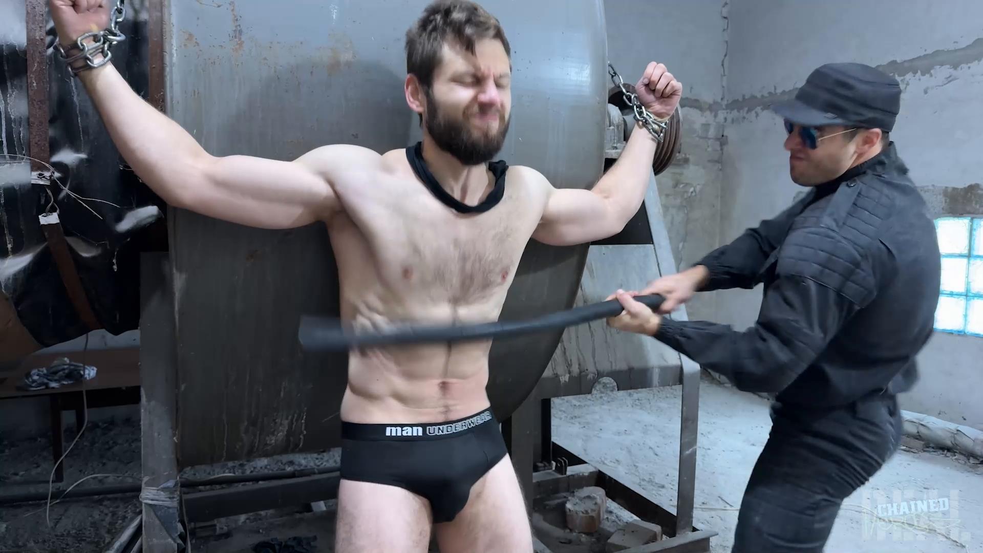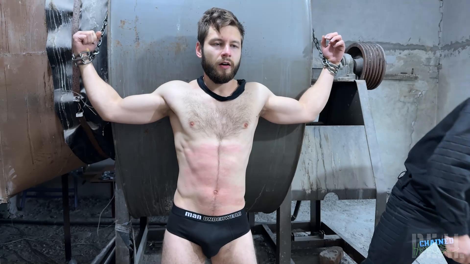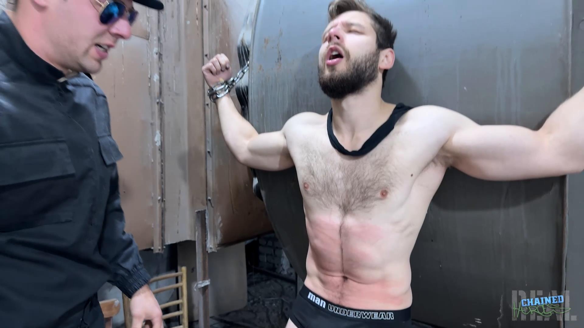 Commando DIMA has been captured by THE ENEMY, and is now put "ON TRIAL” by The Judge while simultaneously being TORTURED by Captain ALEX - PART 1 of 3: “THE TRIAL” BEGINS - DIMA is standing barefoot on bricks, wearing only small, tight, black underwear. He is chained at his wrists & ankles with his arms & legs spread to a large metal drum. DIMA is blindfolded. Next to him, a table with the TORTURE TOOLS he will soon become all-too-familiar with: 2 medium-size Torx screwdrivers, a metal claw & a rubber hose, to be used while The Judge “Confirms or Corrects” DIMA’s first three “Statements”…