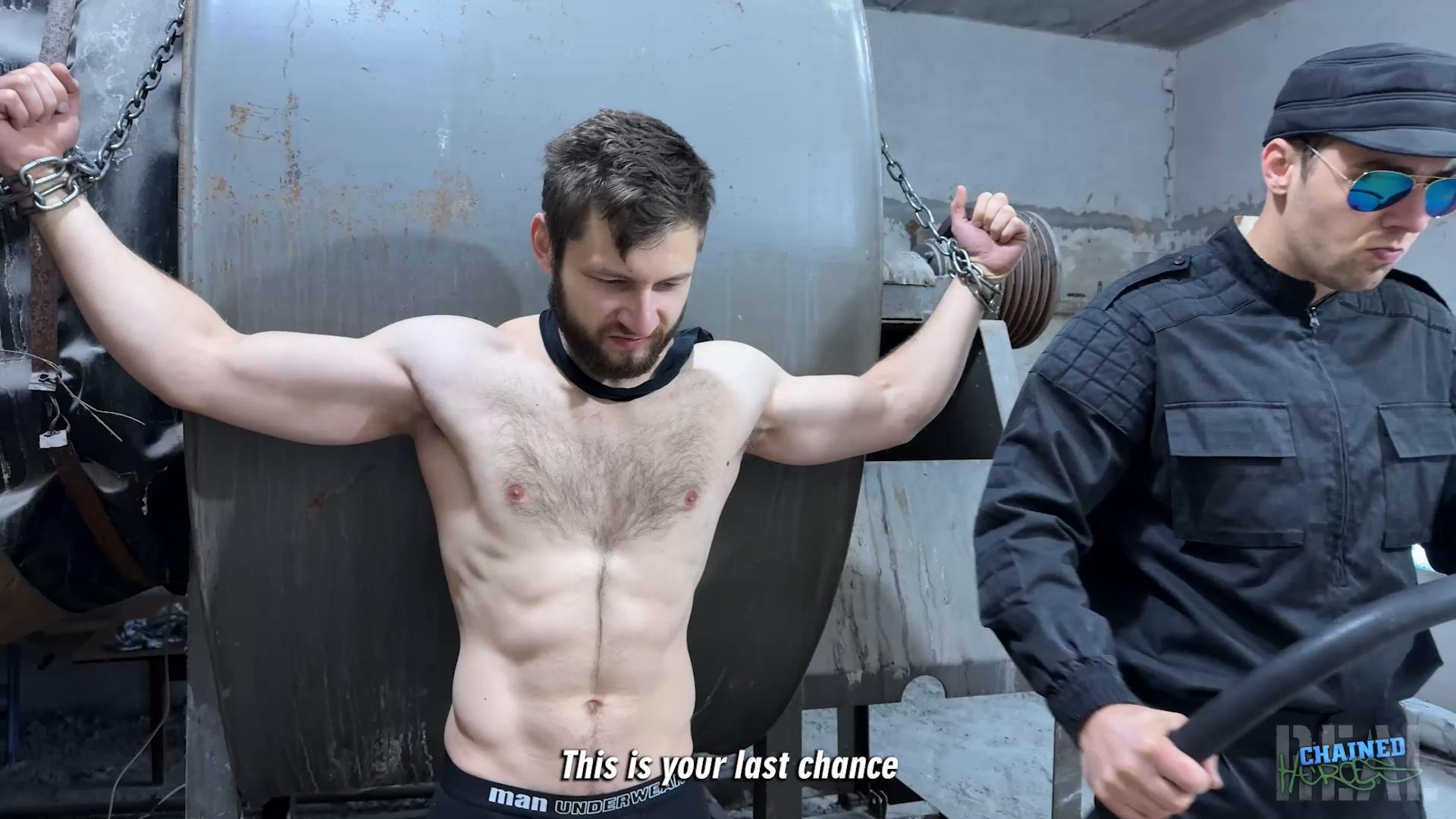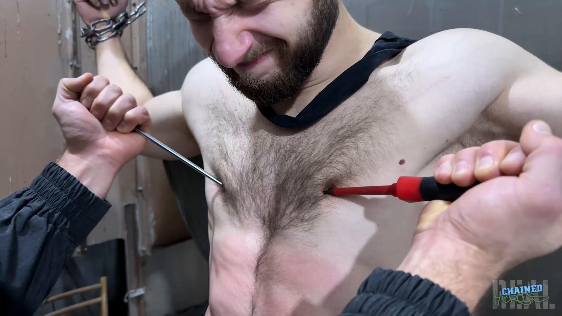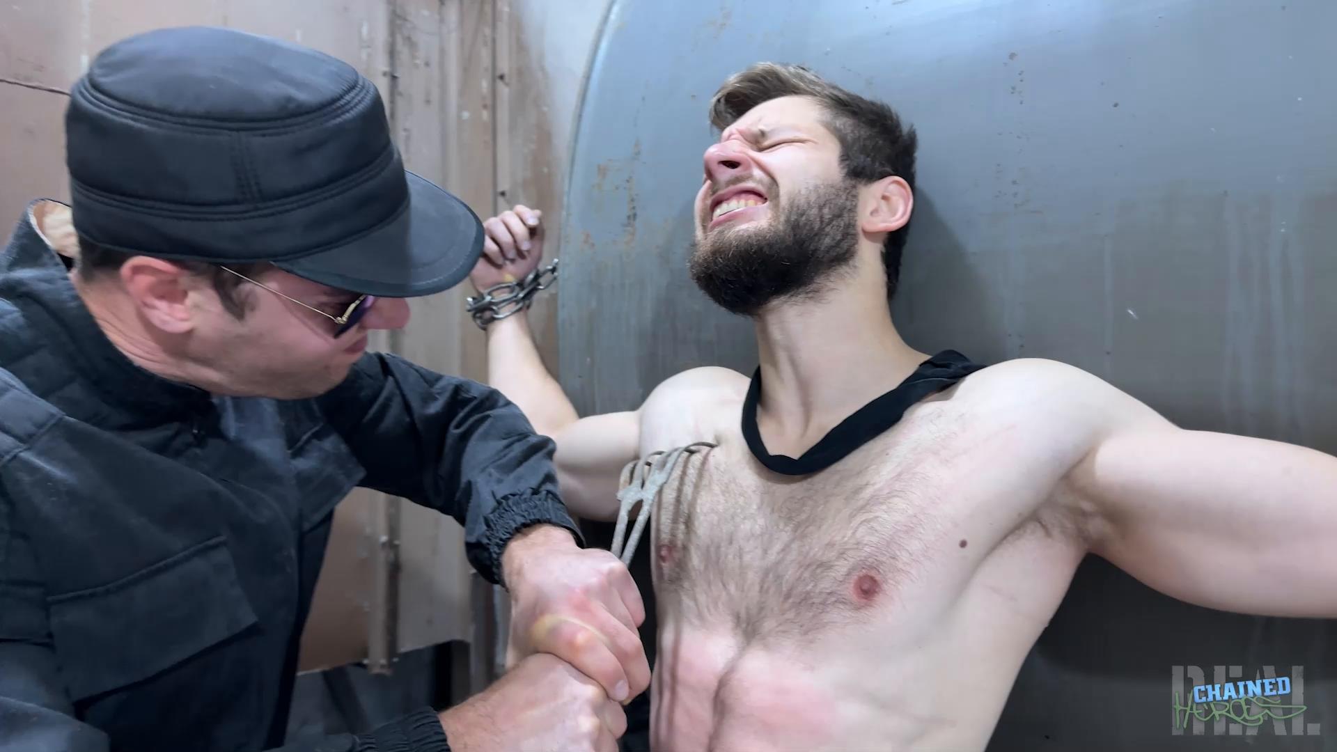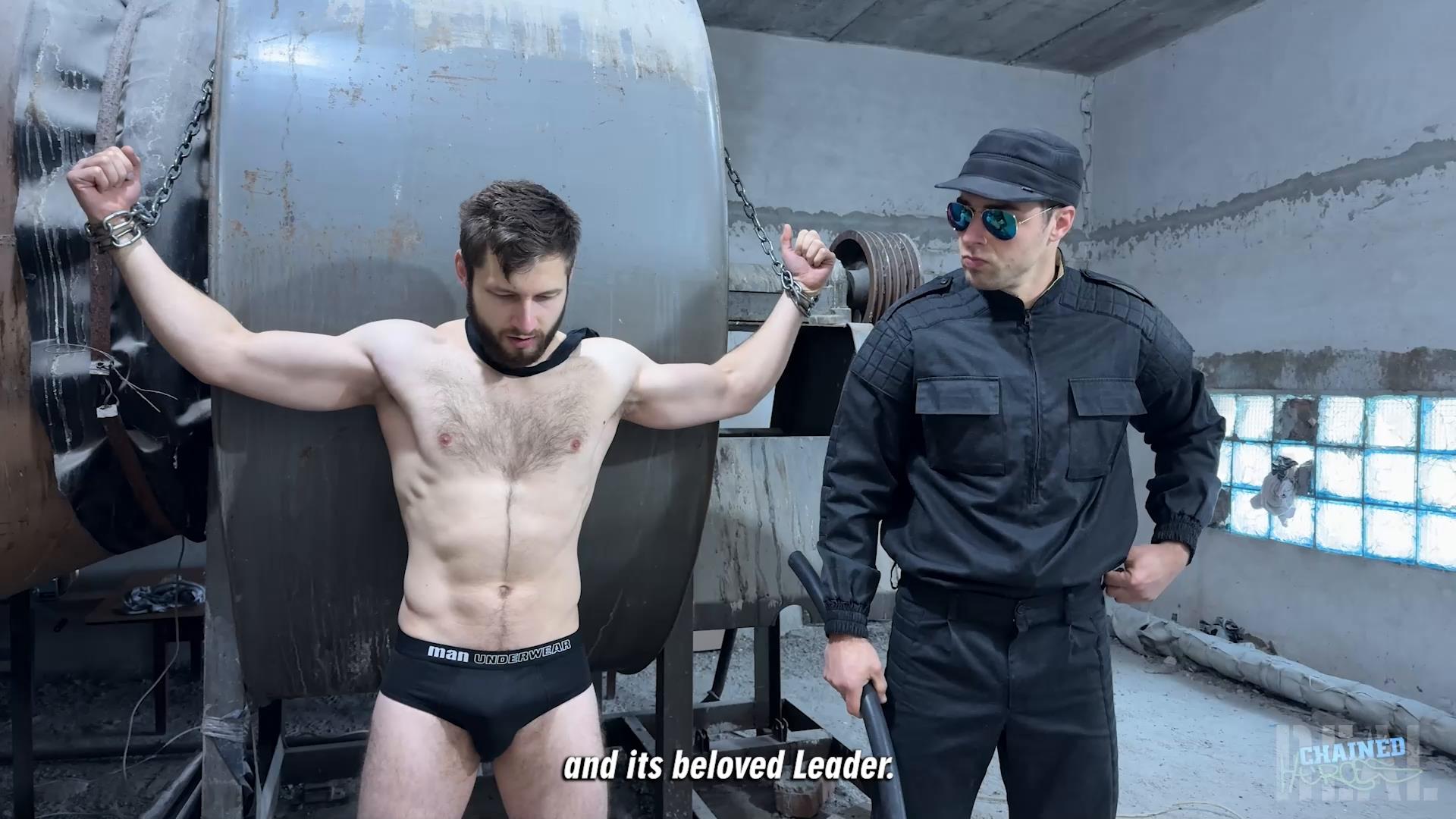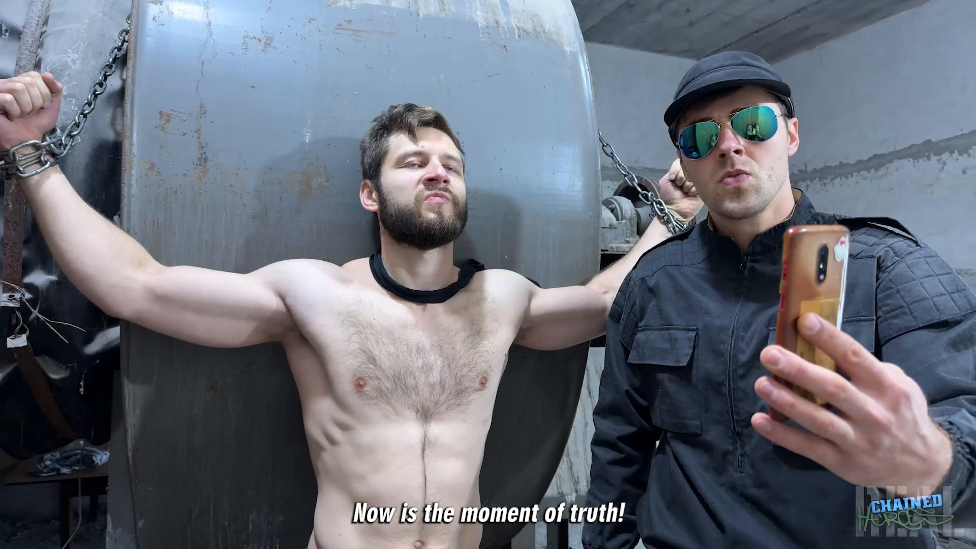 Commando DIMA has been captured by THE ENEMY, and is now put "ON TRIAL” by The Judge while simultaneously being TORTURED by Captain ALEX - PART 1 of 3: “THE TRIAL” BEGINS - DIMA is standing barefoot on bricks, wearing only small, tight, black underwear. He is chained at his wrists & ankles with his arms & legs spread to a large metal drum. DIMA is blindfolded. Next to him, a table with the TORTURE TOOLS he will soon become all-too-familiar with: 2 medium-size Torx screwdrivers, a metal claw & a rubber hose, to be used while The Judge “Confirms or Corrects” DIMA’s first three “Statements”…