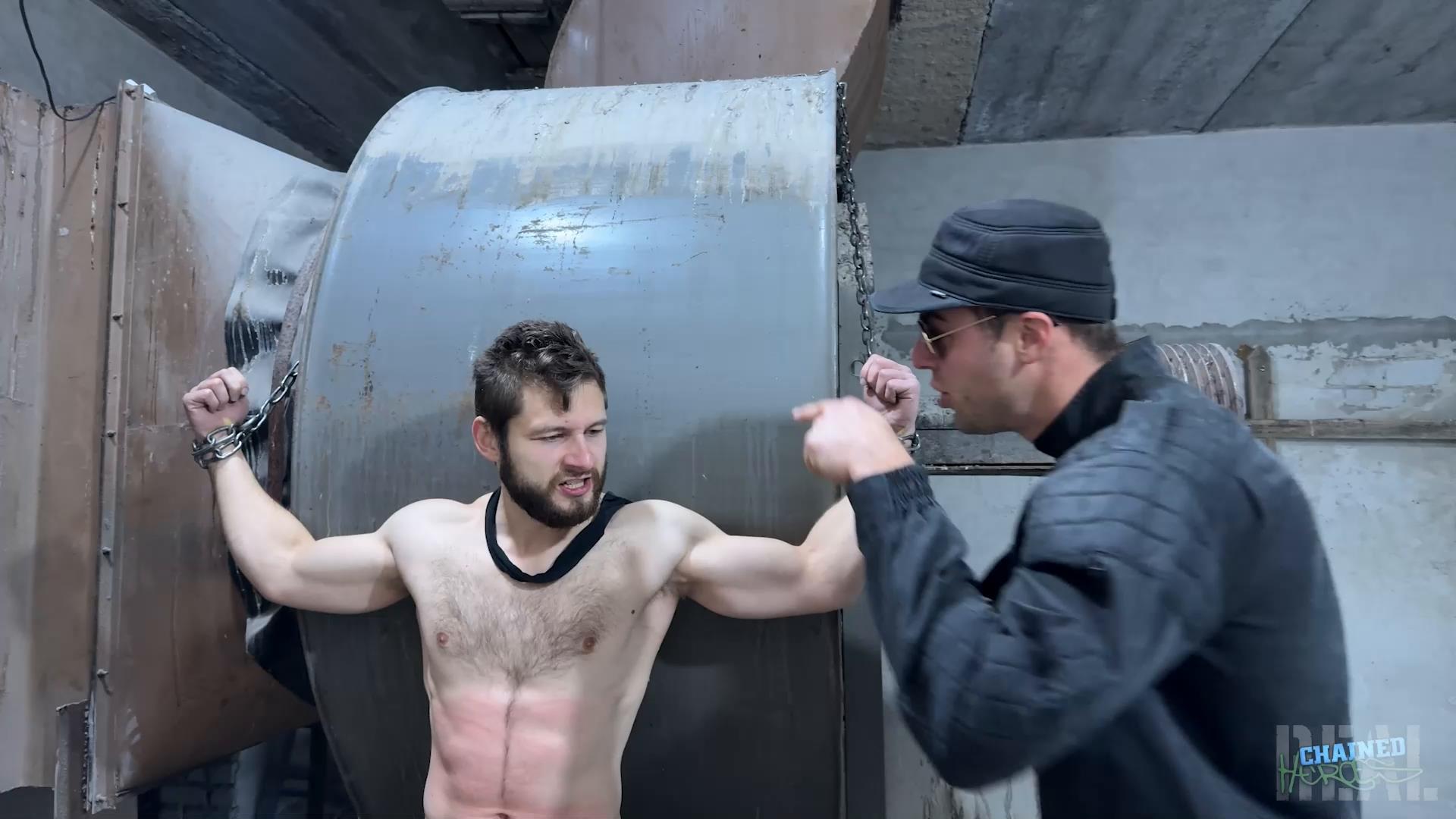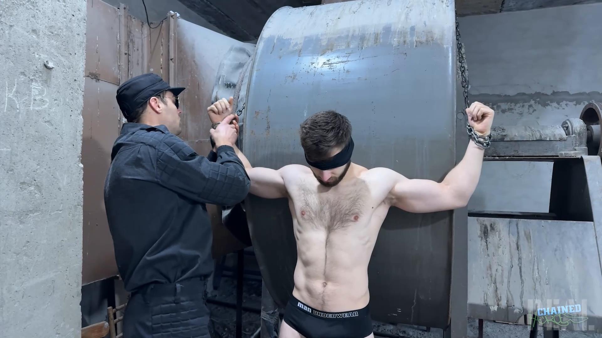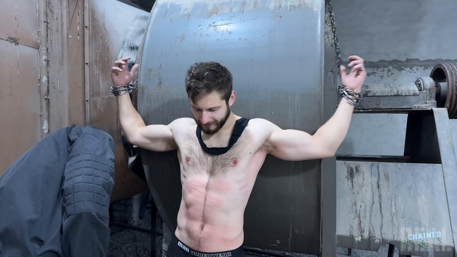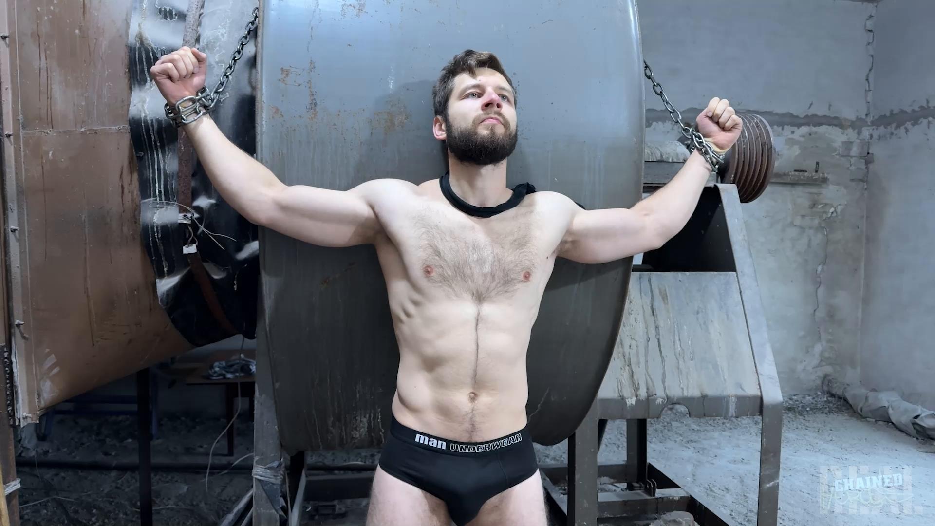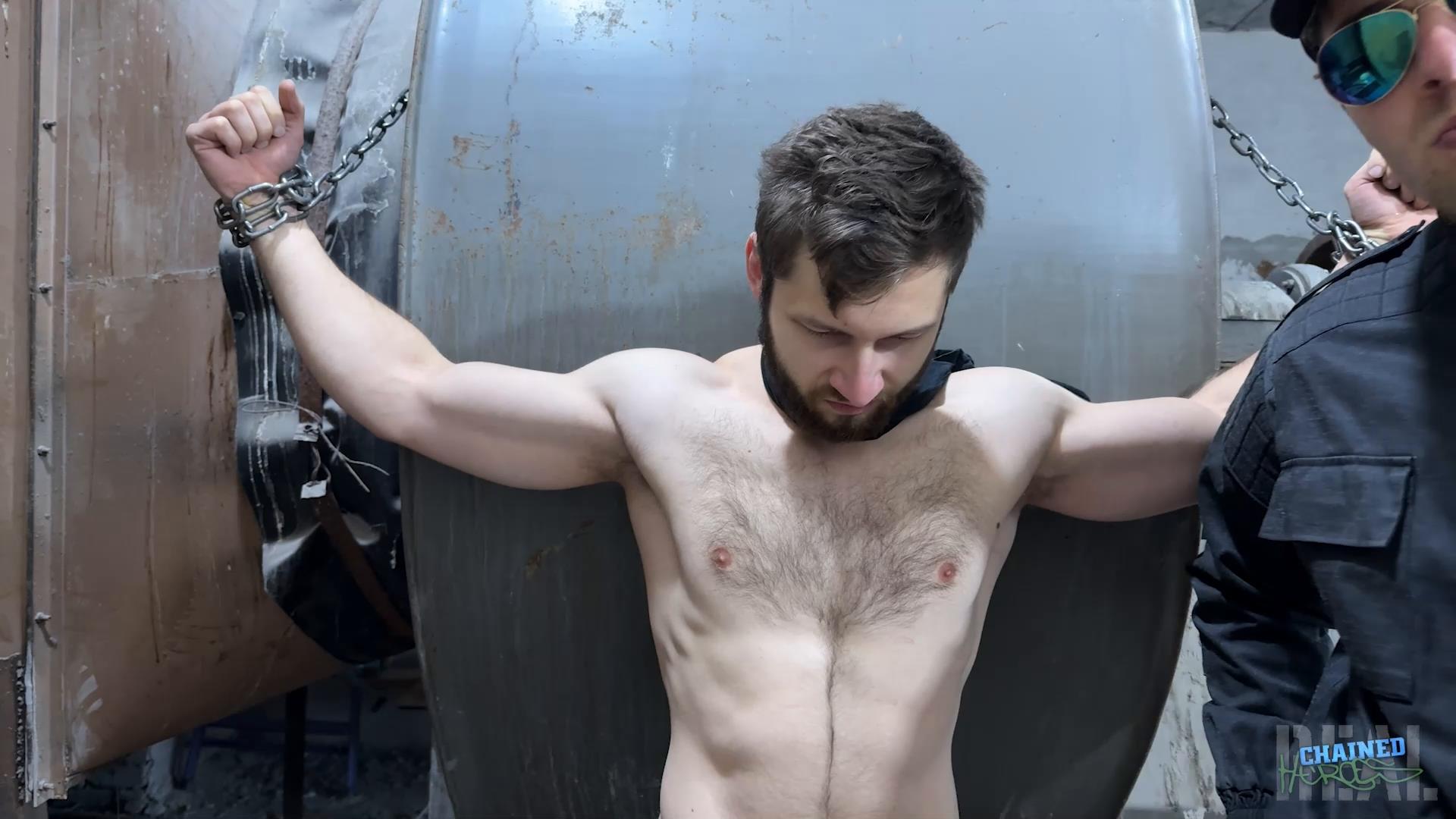 Commando DIMA has been captured by THE ENEMY, and is now put "ON TRIAL” by The Judge while simultaneously being TORTURED by Captain ALEX - PART 1 of 3: “THE TRIAL” BEGINS - DIMA is standing barefoot on bricks, wearing only small, tight, black underwear. He is chained at his wrists & ankles with his arms & legs spread to a large metal drum. DIMA is blindfolded. Next to him, a table with the TORTURE TOOLS he will soon become all-too-familiar with: 2 medium-size Torx screwdrivers, a metal claw & a rubber hose, to be used while The Judge “Confirms or Corrects” DIMA’s first three “Statements”…