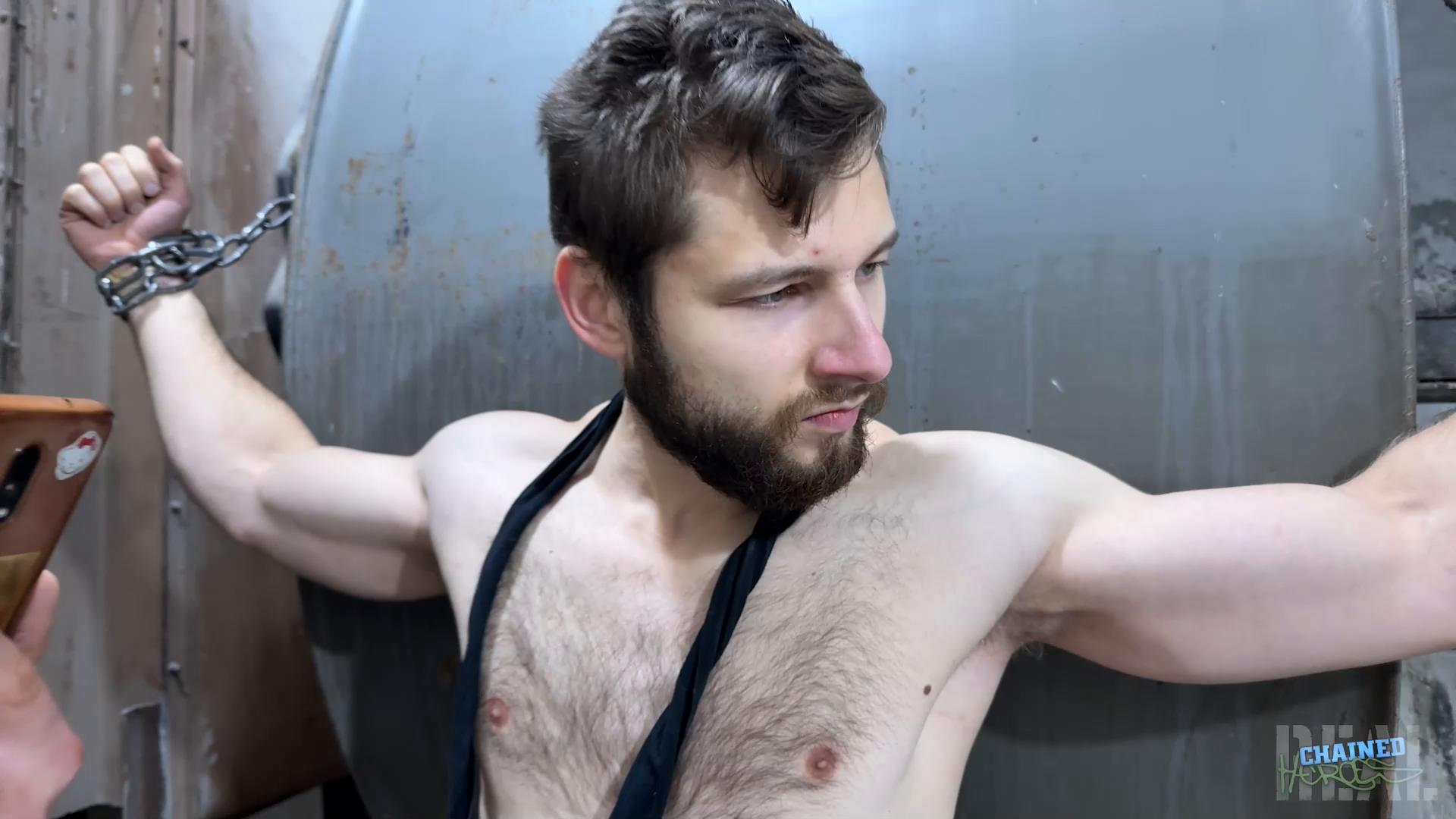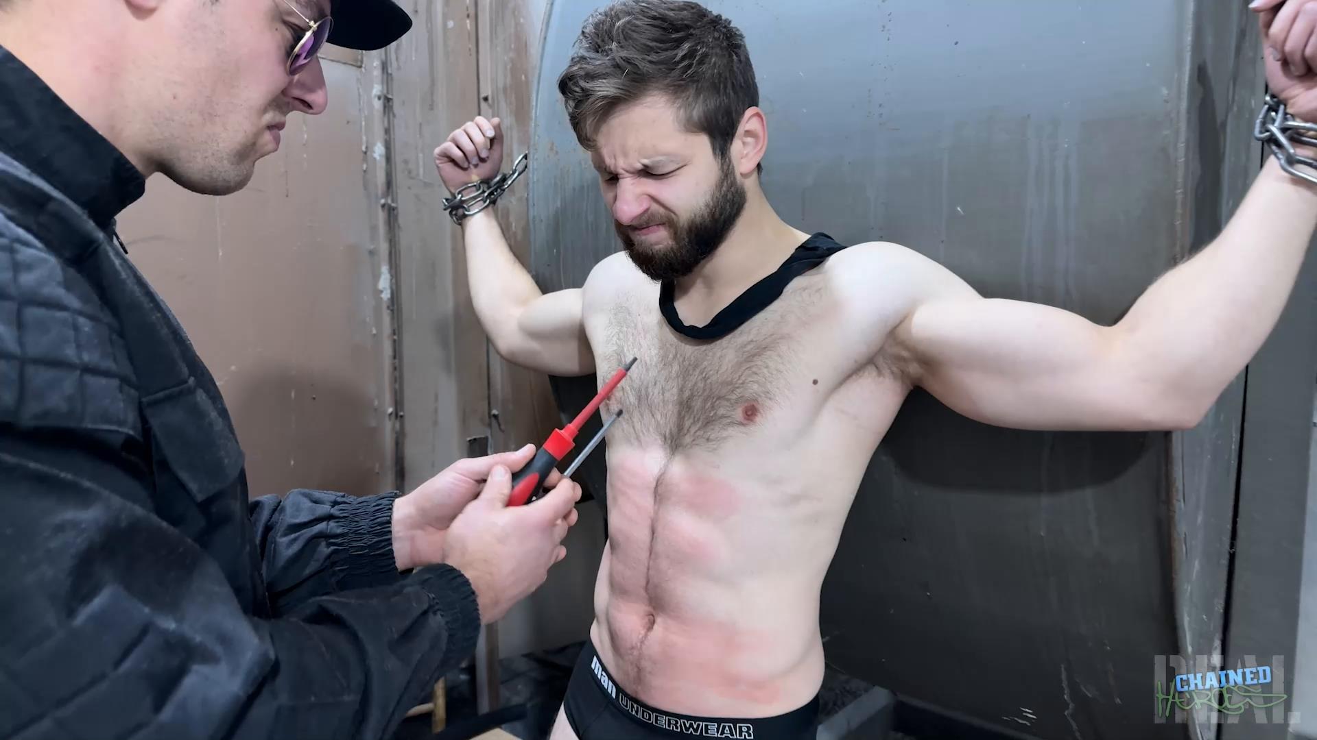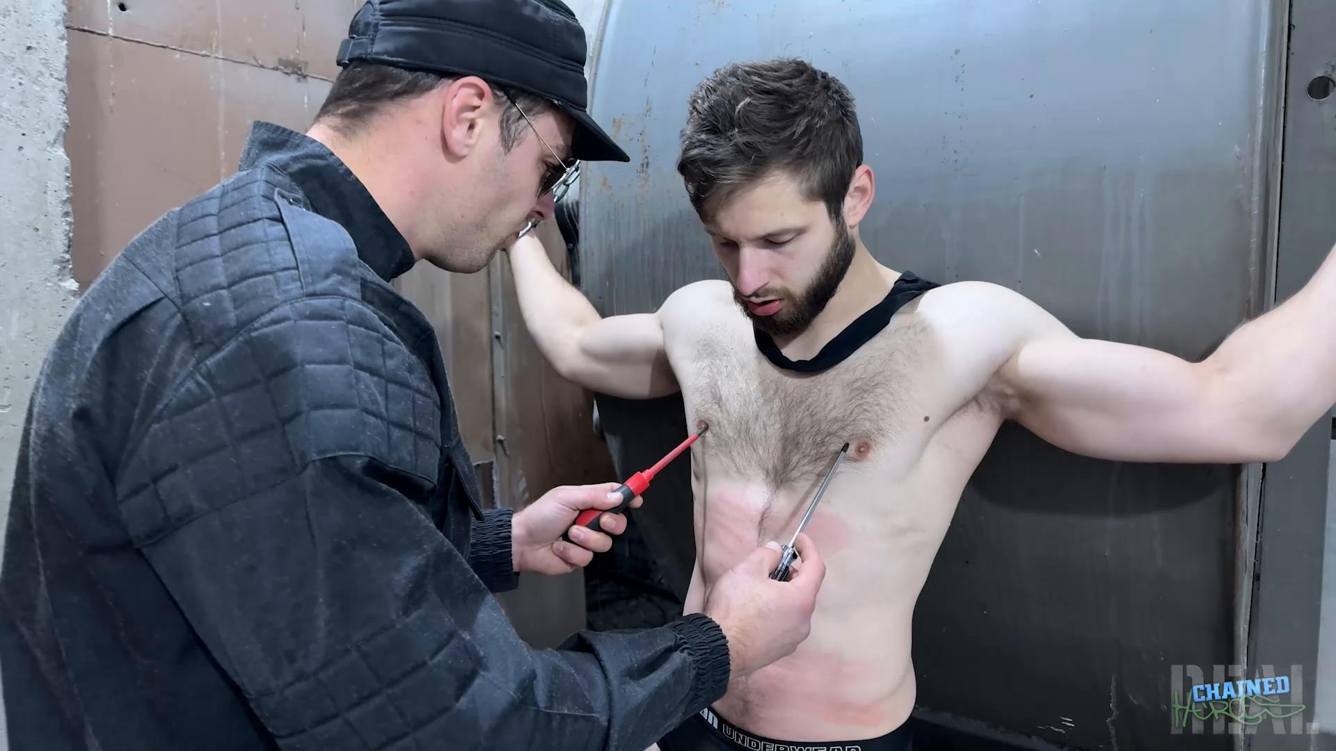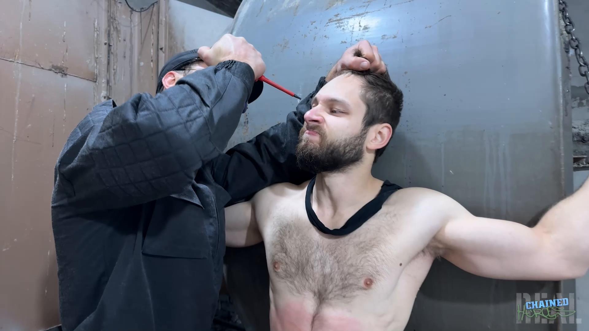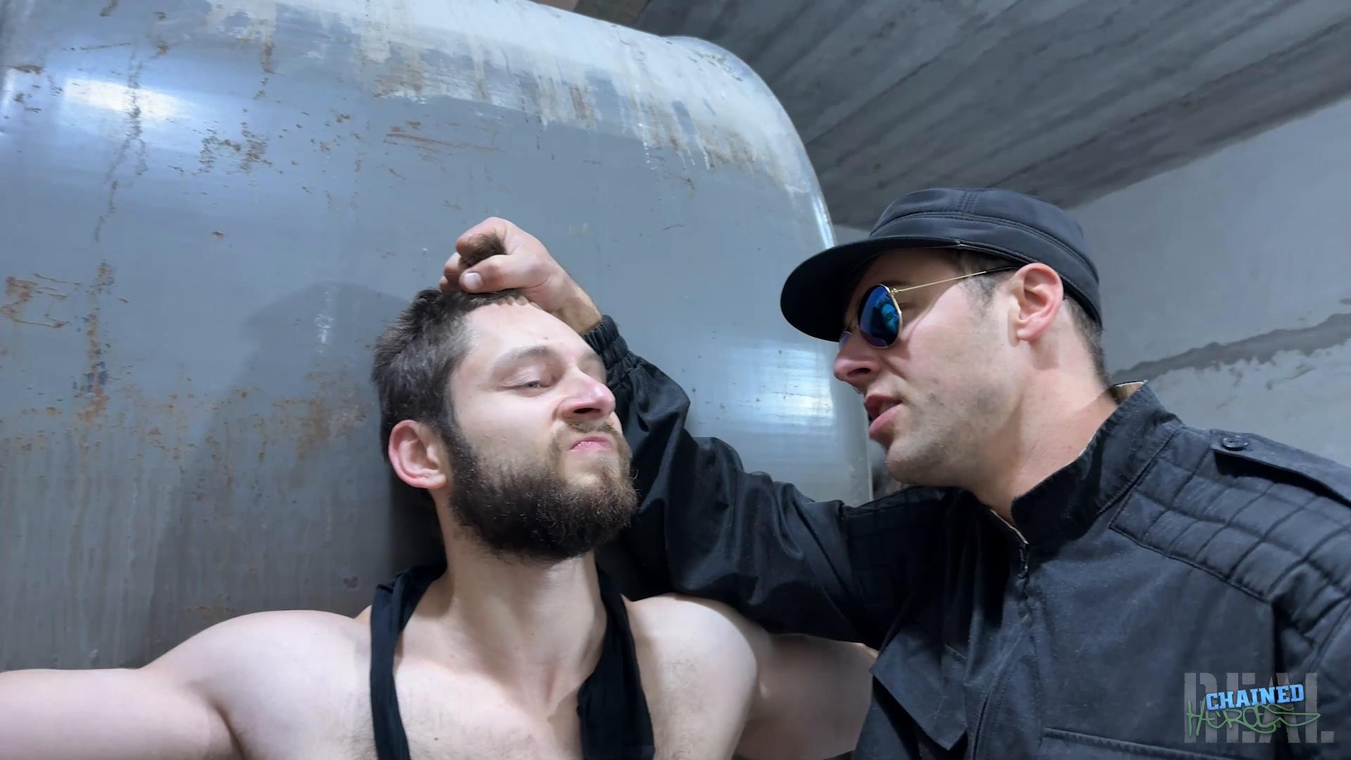 Commando DIMA has been captured by THE ENEMY, and is now put "ON TRIAL” by The Judge while simultaneously being TORTURED by Captain ALEX - PART 1 of 3: “THE TRIAL” BEGINS - DIMA is standing barefoot on bricks, wearing only small, tight, black underwear. He is chained at his wrists & ankles with his arms & legs spread to a large metal drum. DIMA is blindfolded. Next to him, a table with the TORTURE TOOLS he will soon become all-too-familiar with: 2 medium-size Torx screwdrivers, a metal claw & a rubber hose, to be used while The Judge “Confirms or Corrects” DIMA’s first three “Statements”…