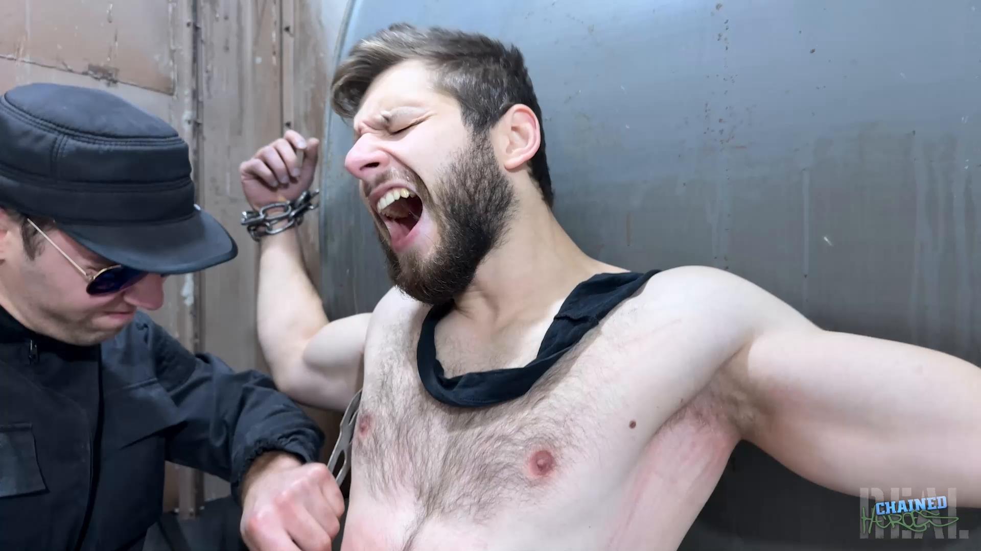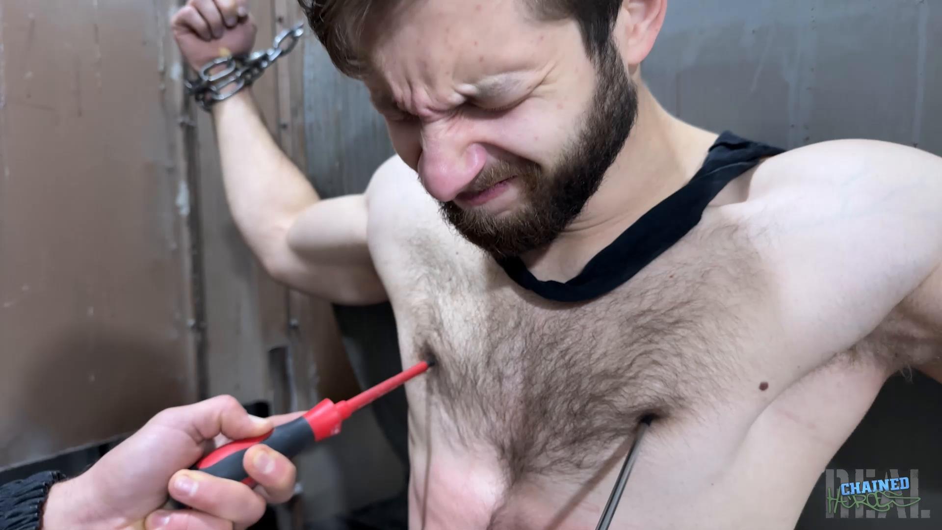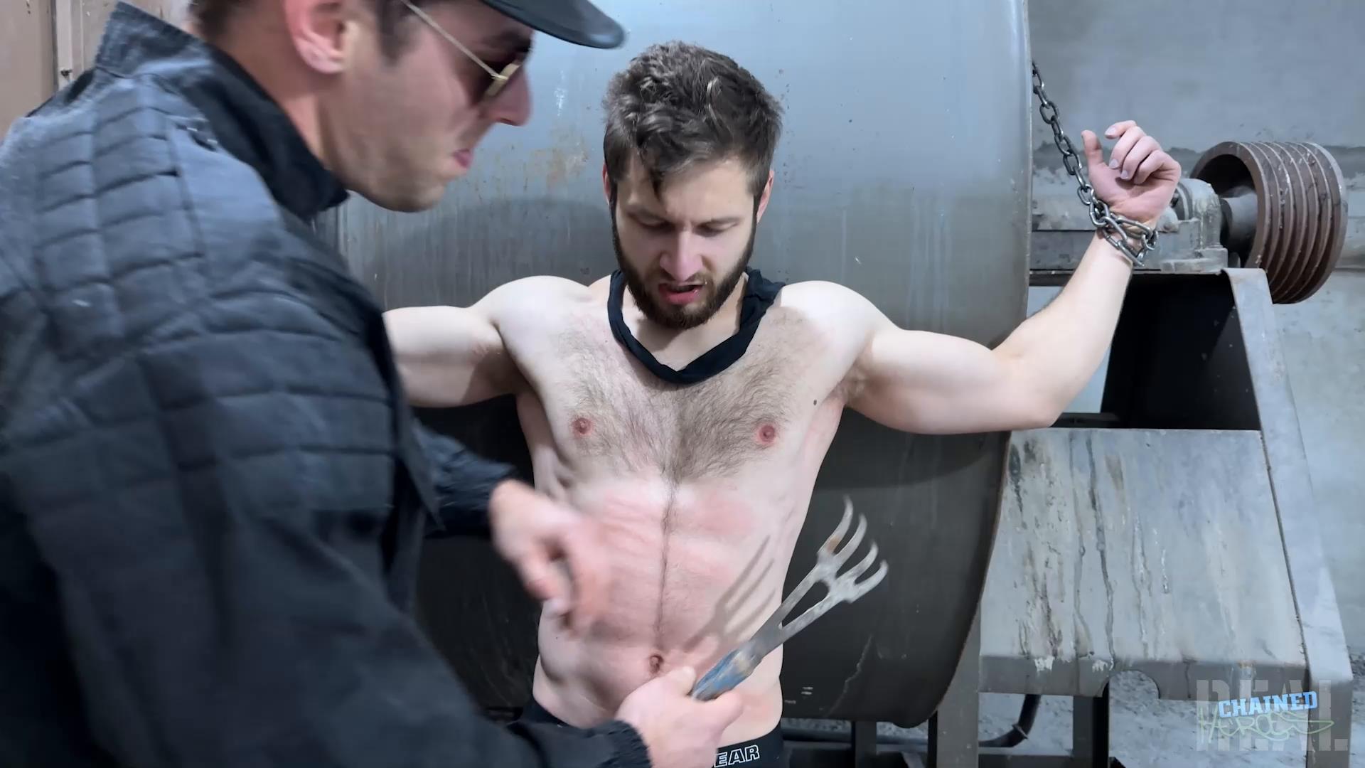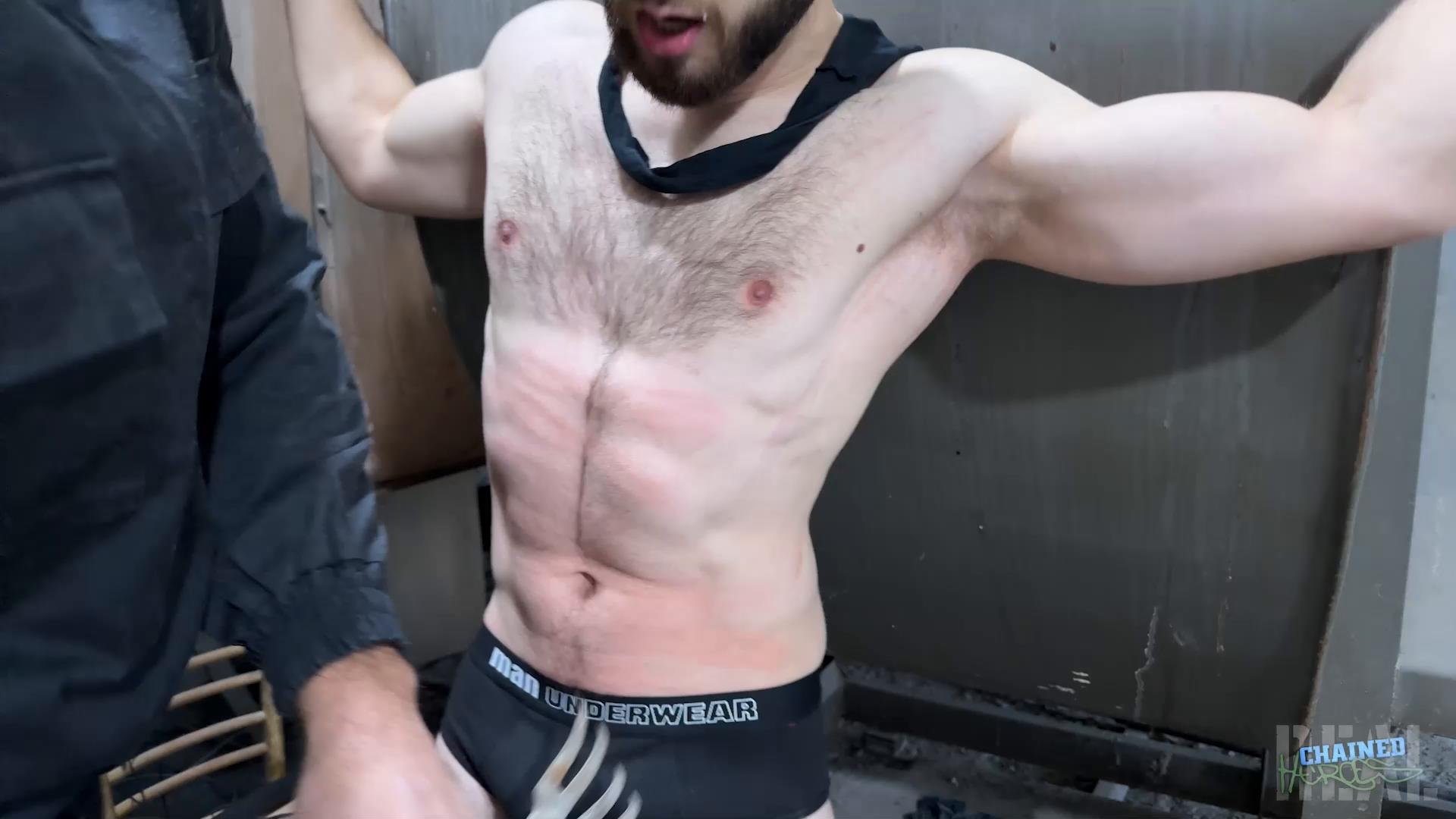 Commando DIMA has been captured by THE ENEMY, and is now put "ON TRIAL” by The Judge while simultaneously being TORTURED by Captain ALEX - PART 1 of 3: “THE TRIAL” BEGINS - DIMA is standing barefoot on bricks, wearing only small, tight, black underwear. He is chained at his wrists & ankles with his arms & legs spread to a large metal drum. DIMA is blindfolded. Next to him, a table with the TORTURE TOOLS he will soon become all-too-familiar with: 2 medium-size Torx screwdrivers, a metal claw & a rubber hose, to be used while The Judge “Confirms or Corrects” DIMA’s first three “Statements”…