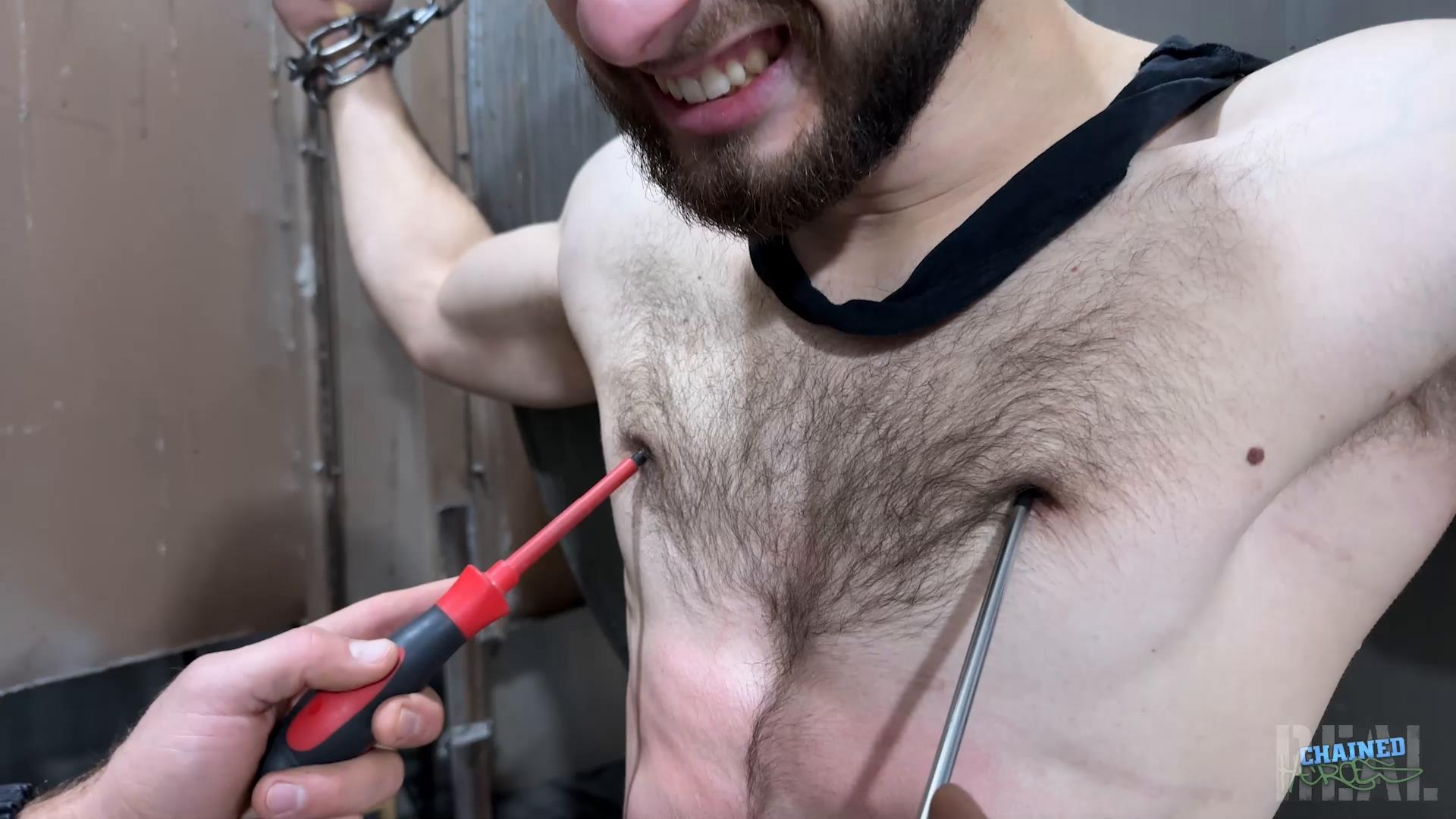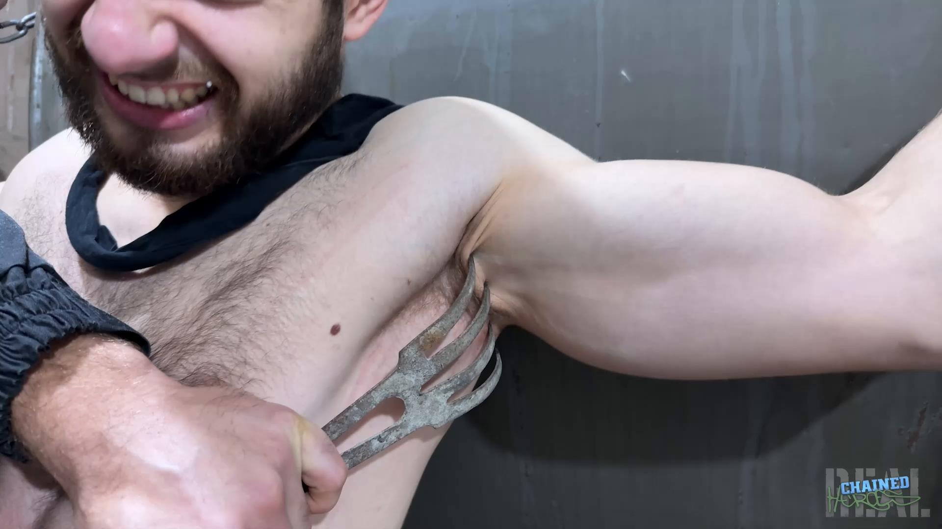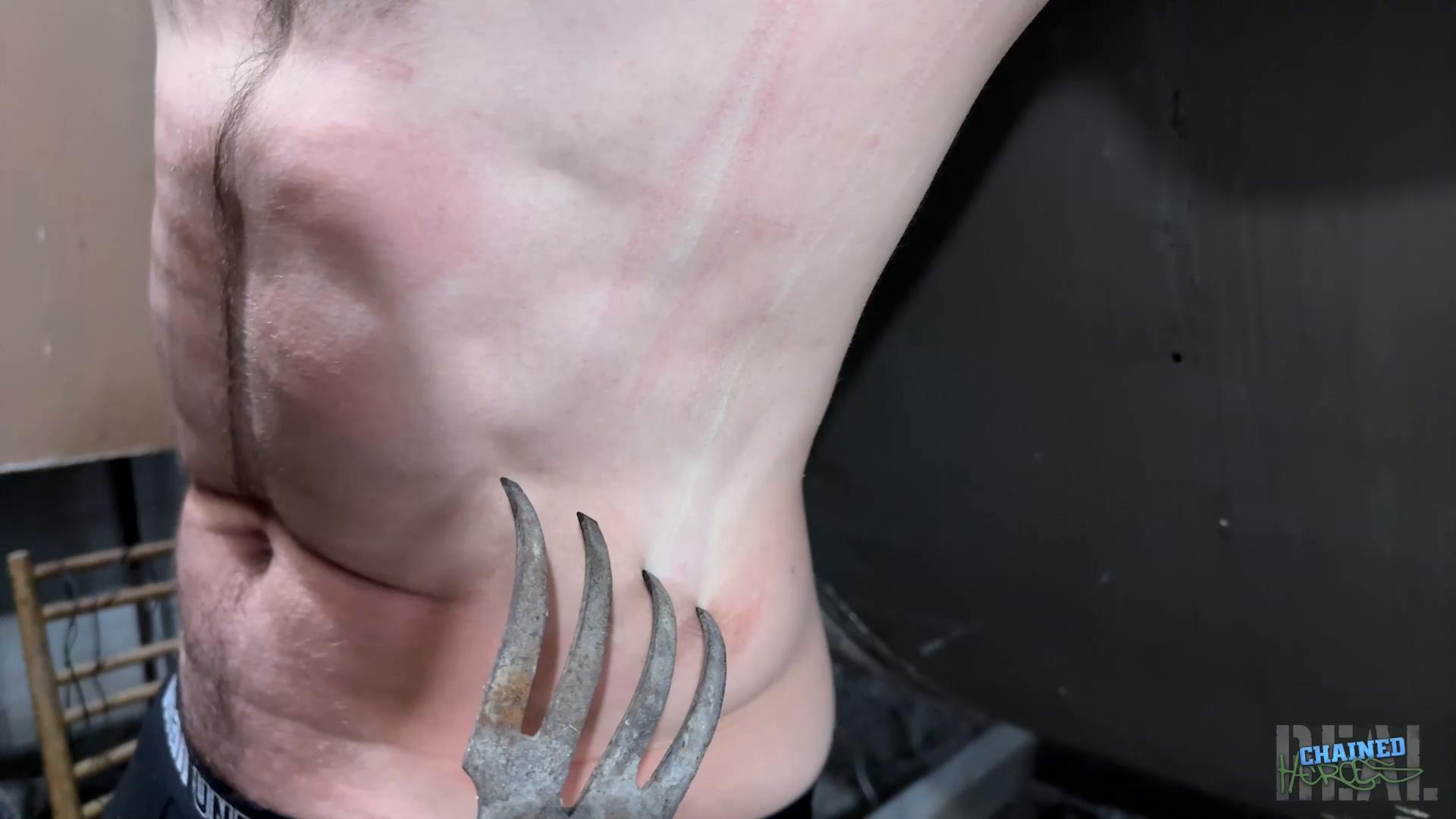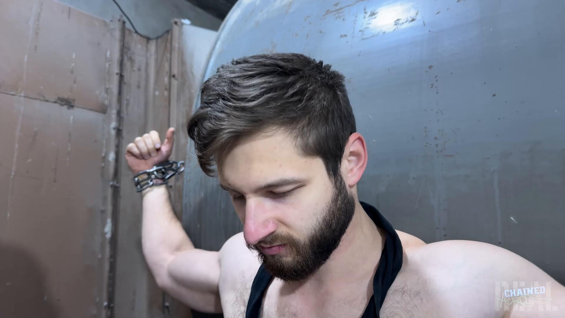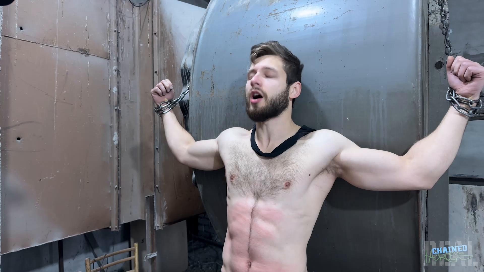 Commando DIMA has been captured by THE ENEMY, and is now put "ON TRIAL” by The Judge while simultaneously being TORTURED by Captain ALEX - PART 1 of 3: “THE TRIAL” BEGINS - DIMA is standing barefoot on bricks, wearing only small, tight, black underwear. He is chained at his wrists & ankles with his arms & legs spread to a large metal drum. DIMA is blindfolded. Next to him, a table with the TORTURE TOOLS he will soon become all-too-familiar with: 2 medium-size Torx screwdrivers, a metal claw & a rubber hose, to be used while The Judge “Confirms or Corrects” DIMA’s first three “Statements”…